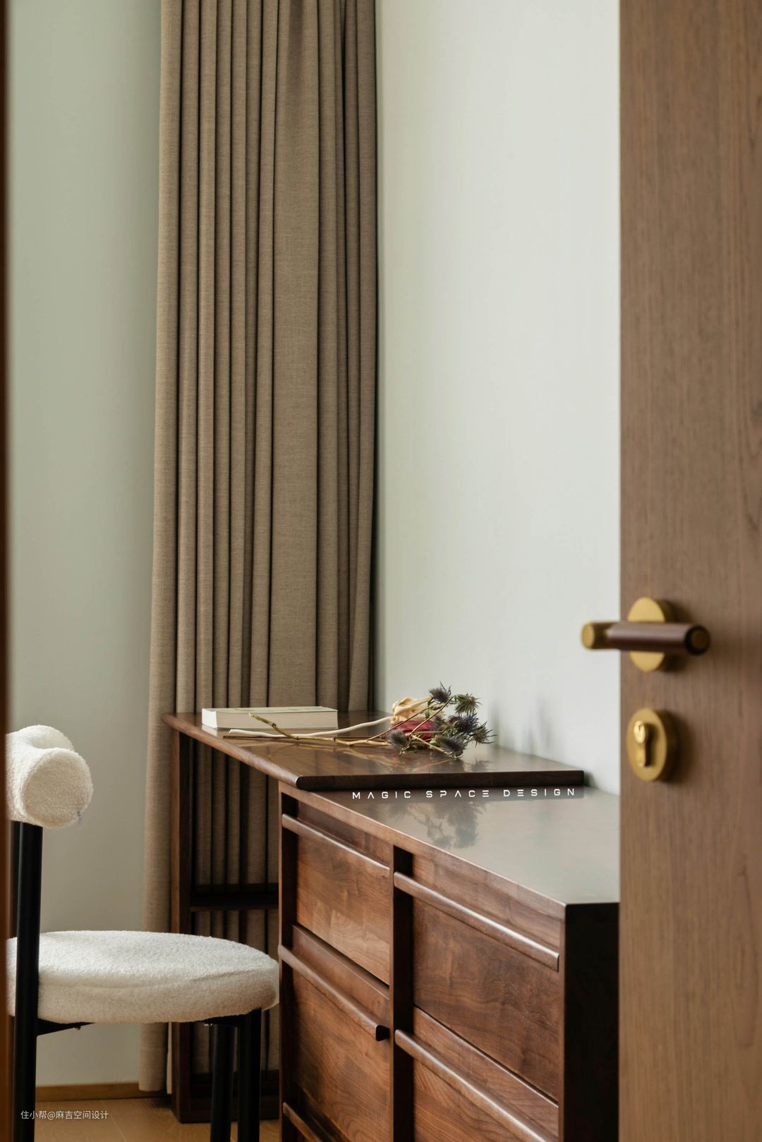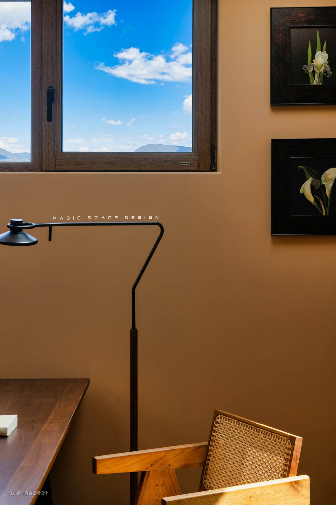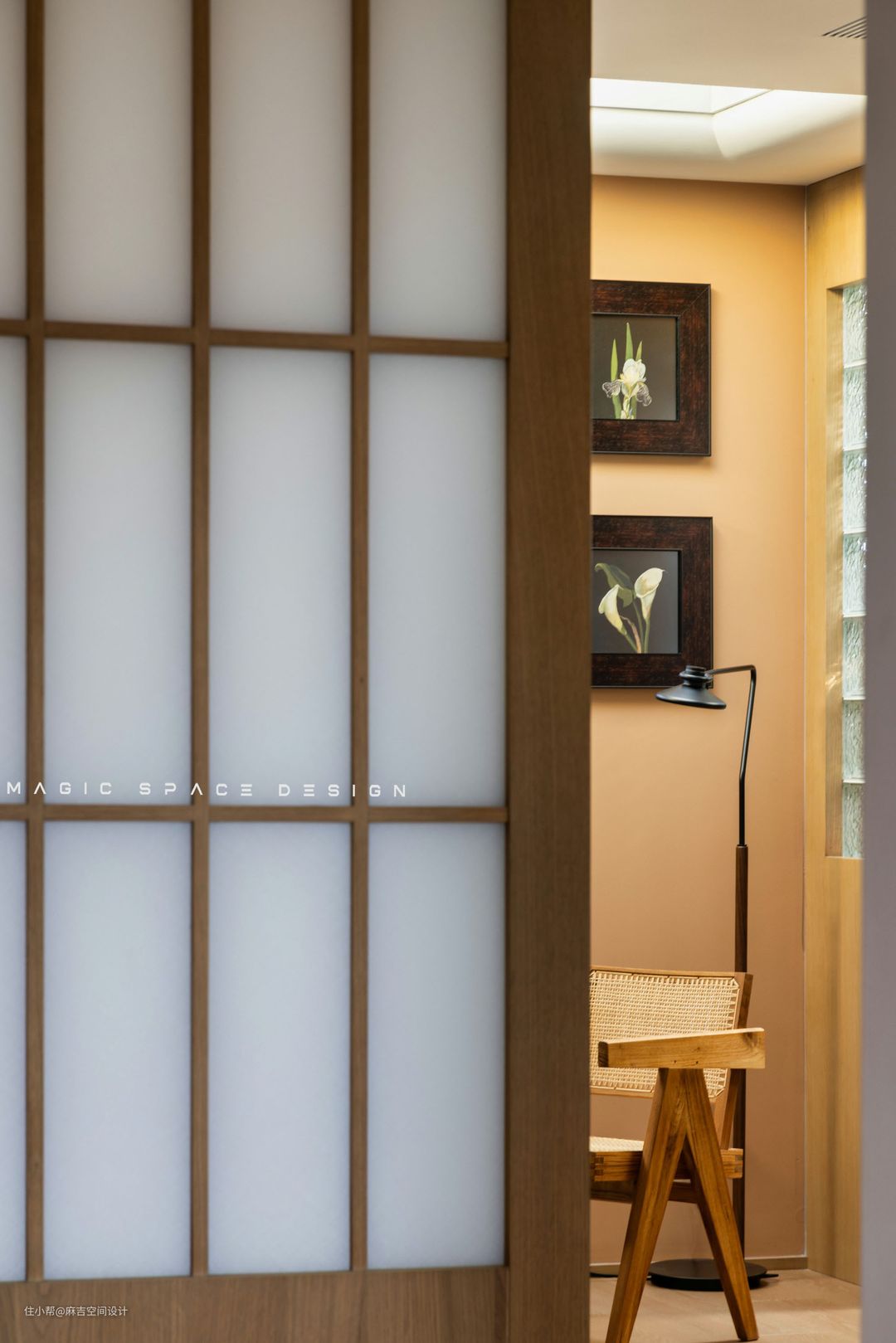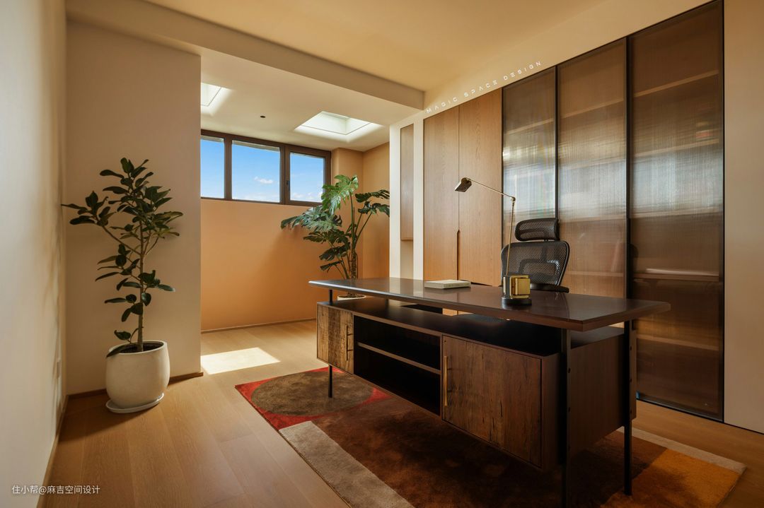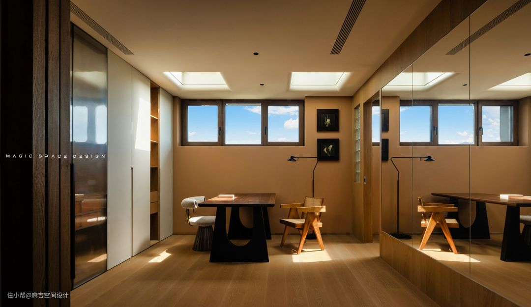 女主书房,糅合多种木元素酝酿诗意。设置镜面墙,扩展空间感。连通男女主书房,于侧旁嵌入水晶砖隔断,呼应以木纹表达的山水画境,平衡窗与镜的超强光感。