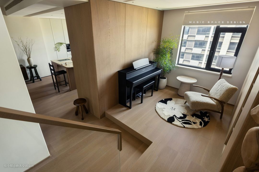 留白基底,携同阶梯完成空间感的跃升,予以感知与心灵最大的自由体验。打造地台,衔接两层之间的枢纽区,一架钢琴,一把软椅,勾勒出家人欢聚的时刻。