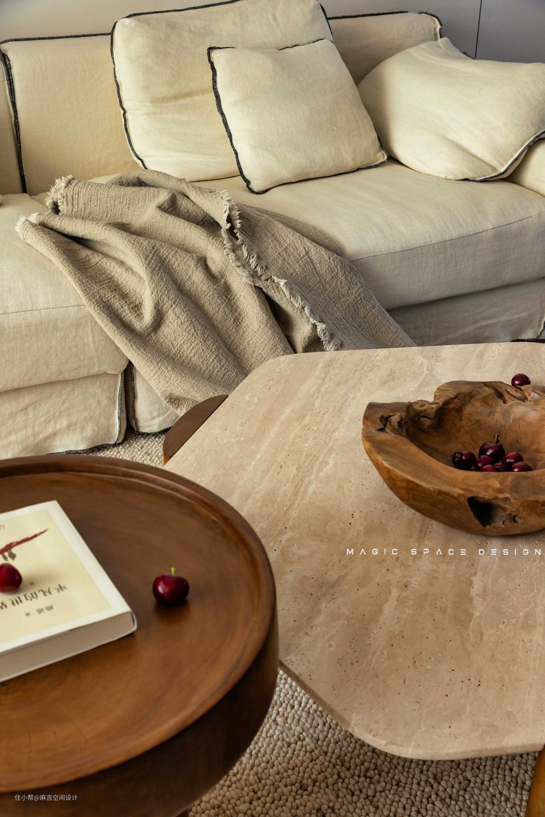 一层客房门做隐形处理,给予沙发背景洁净舒展的感觉,比利时雨露亚麻布艺,溢出自在呼吸的气质,联动印象派油画,吹拂洞石面茶几,凝合成独属此间的自然韵调。