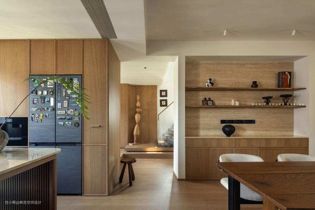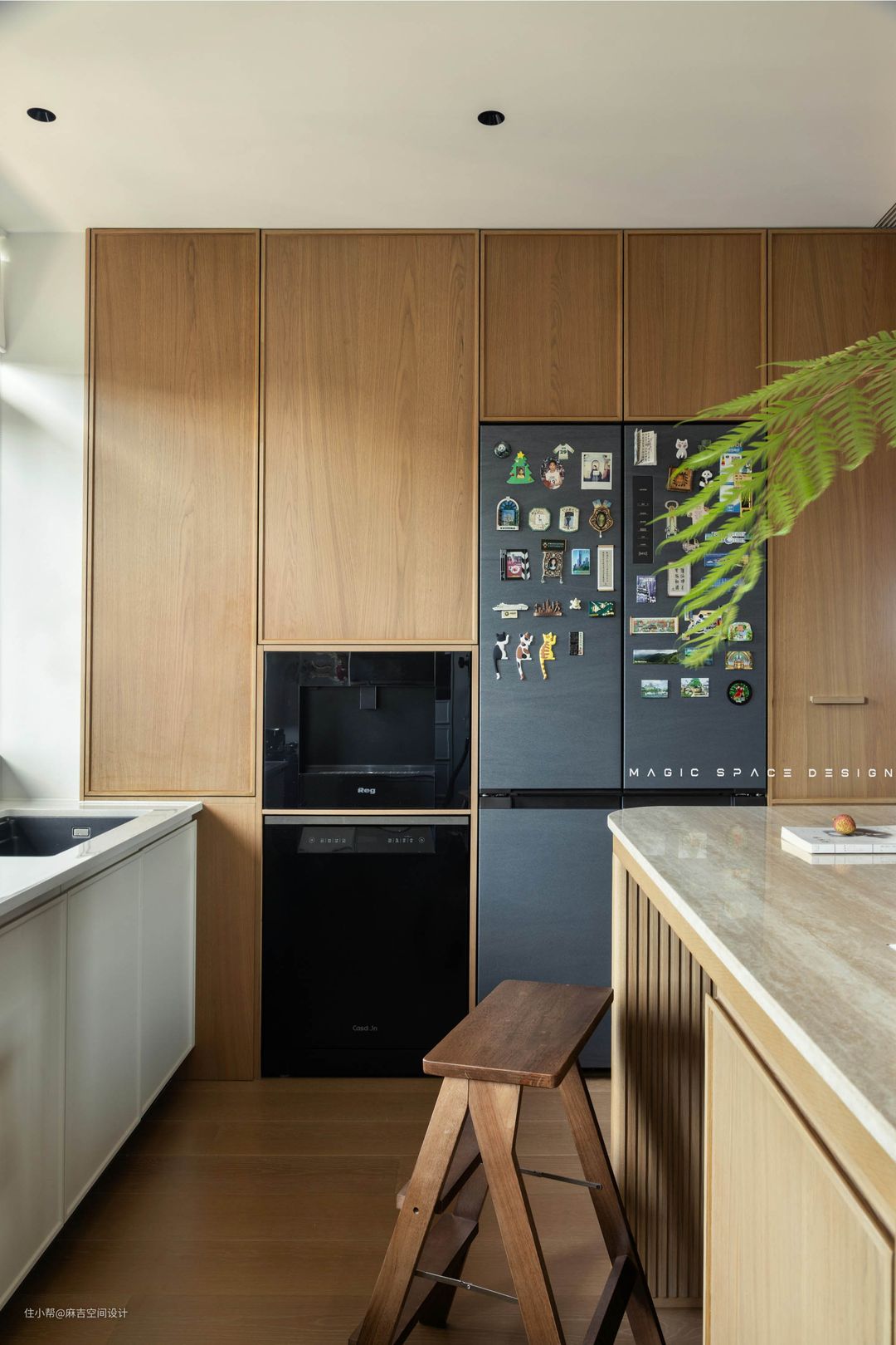 插花,从图画里跃出,中古高脚凳,从厨房岛台移出,亲密互动,达成过渡。除耐擦洗的微水泥之外,厨房大面积使用木饰面还原“置身自然”的意境,以冰箱贴承载周游各国的幸福回忆。