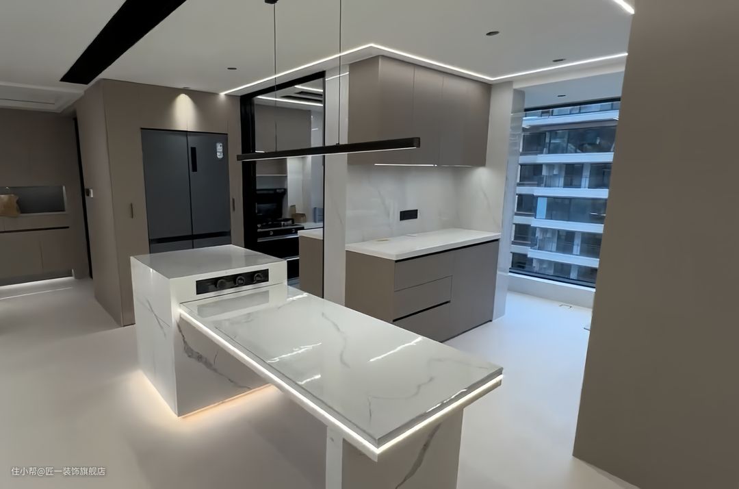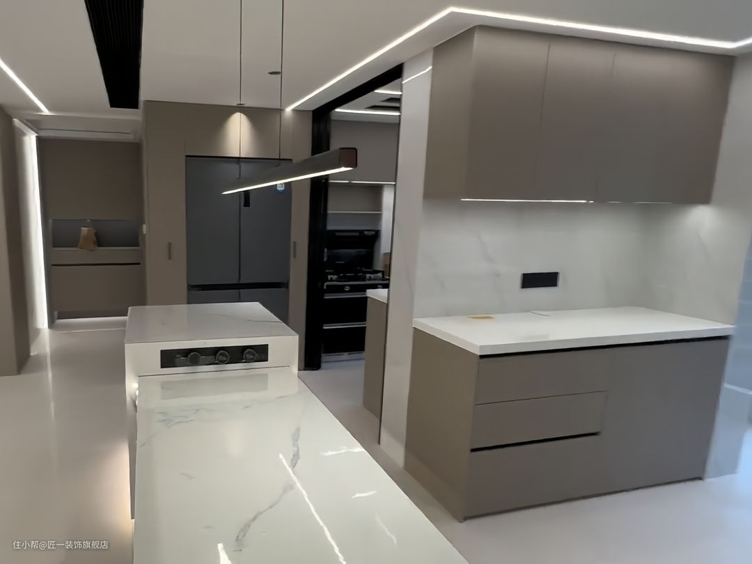 高级灰色橱柜和吊柜,餐厅中间放置白色的岩板岛台和餐桌,形成了一体化的设计。