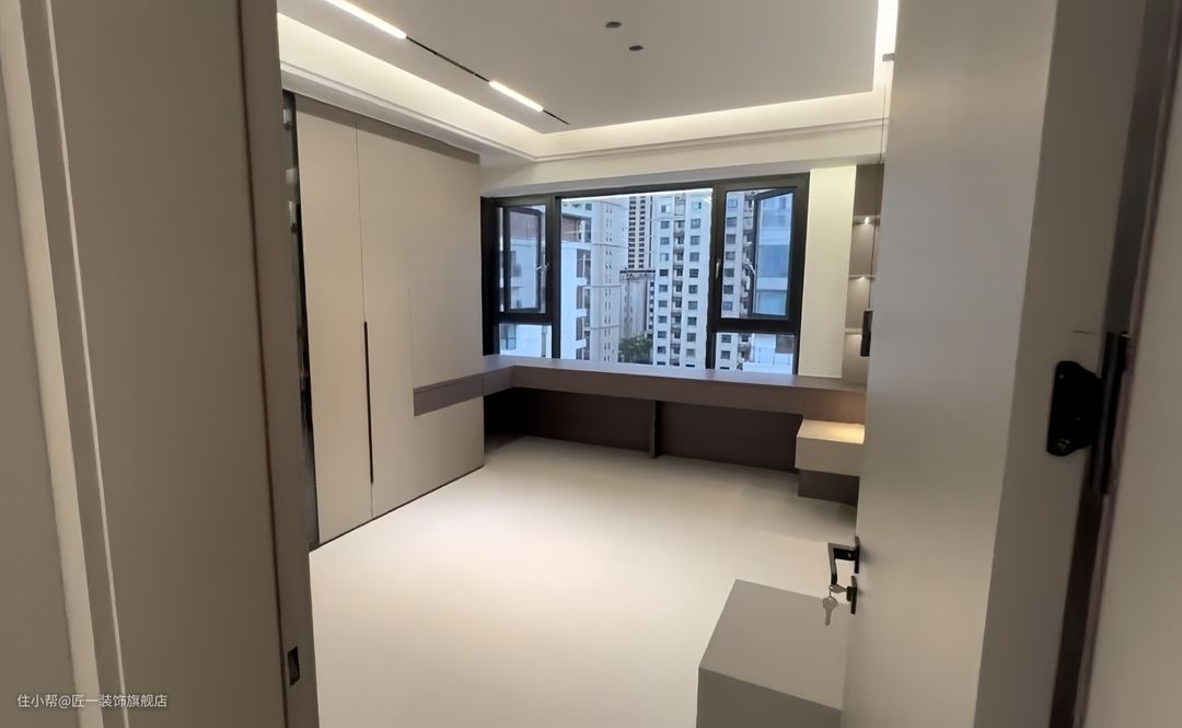 主卧两侧做衣柜,中间做L型的悬空梳妆台的设计,满足了衣物和化妆品的存放需求,同时也提供了化妆和梳妆的功能。这样的设计提供了充足且均匀的照明,同时保持了空间的通透感。