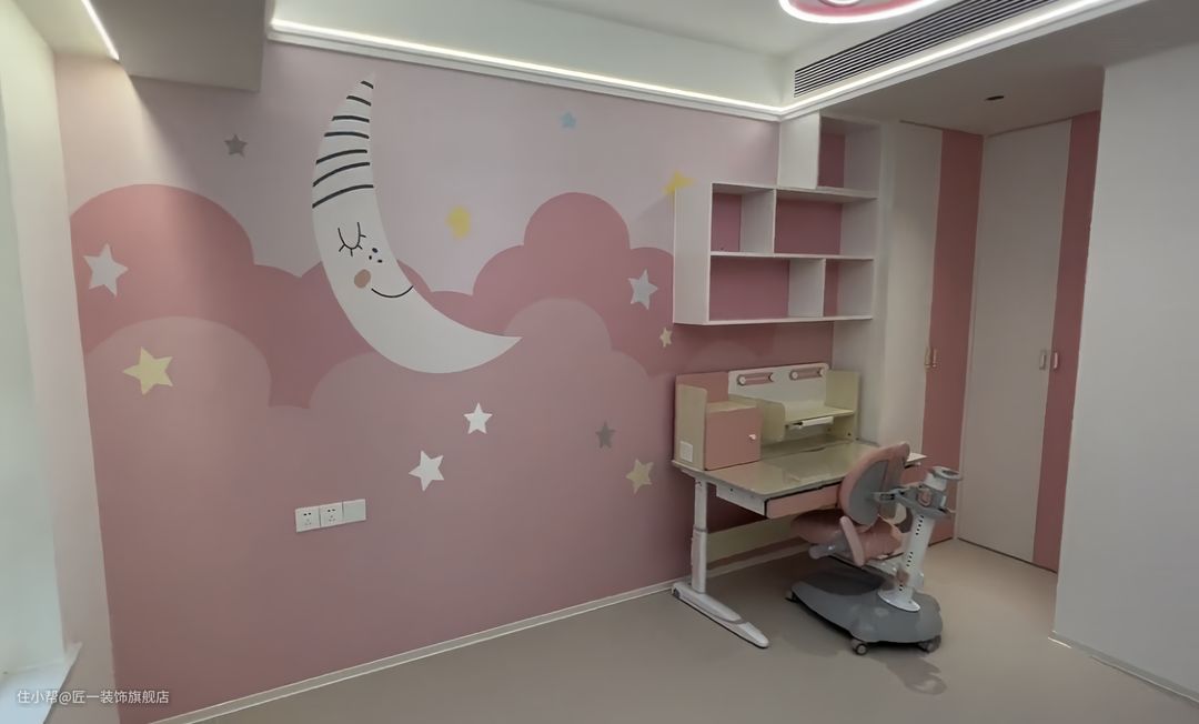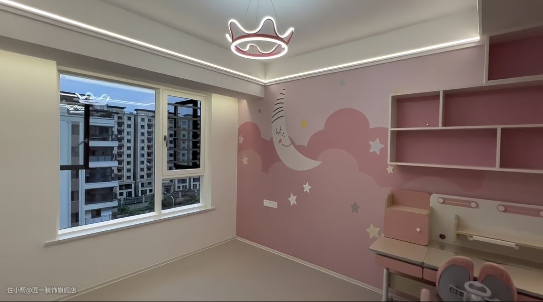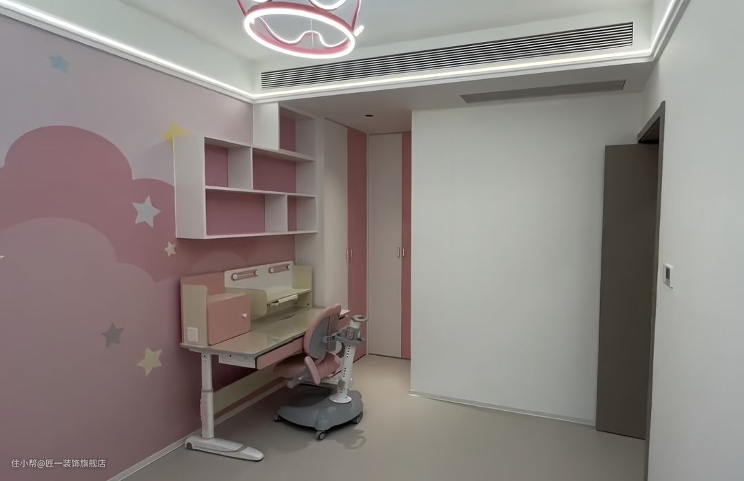 女儿房的墙面做粉色的壁纸,装饰画顶面做石膏线条加层线形灯的设计,使得空间更加有层次感。墙面上做书架,搭配上的书桌,为孩子提供了良好的学习和阅读环境。
