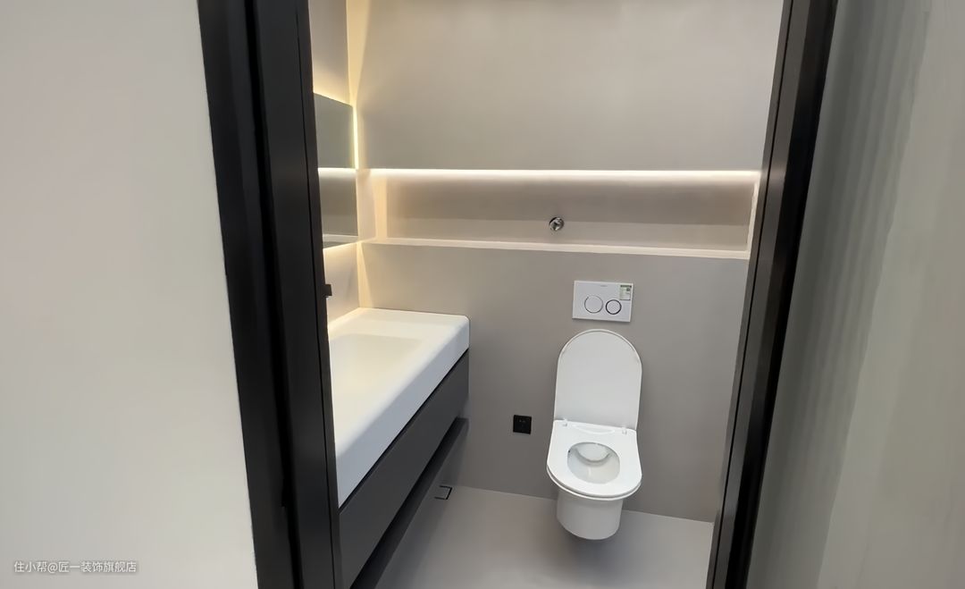 卫生间采用干湿分离的设计,灰白搭配的分体浴室柜和智能除雾浴室镜的配置,提供了舒适和便利的洗浴环境。