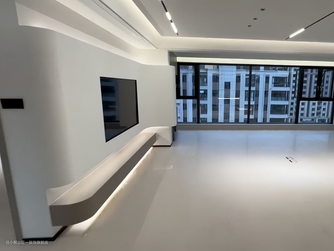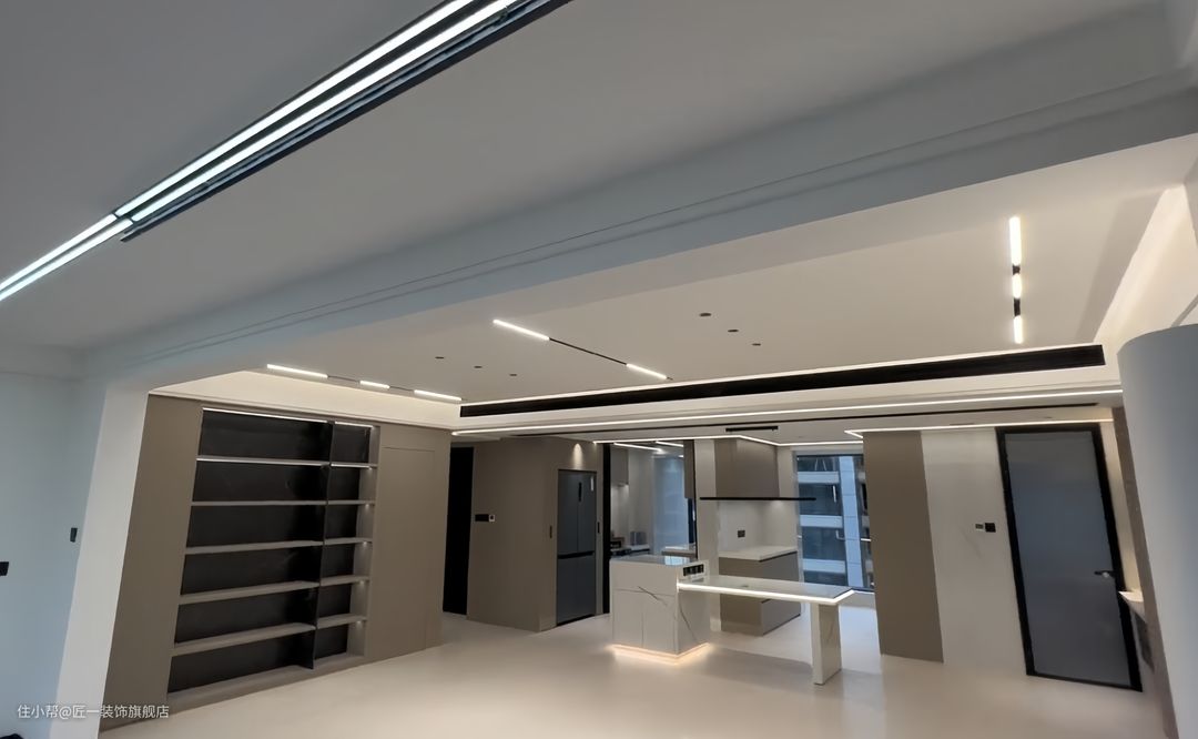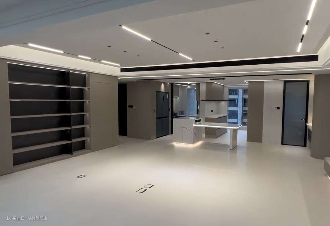 悬浮吊顶和无主灯设计使得客厅显得更为高级和时尚。侧面中央空调侧出风口的设计保证了空调的效率且不影响整体美观。地面铺贴奶油灰色哑光瓷砖,整体性更强。开放式书房一侧做玻璃柜展示,另一侧是电视背景墙的设计,既满足了功能性又增加了美观度。