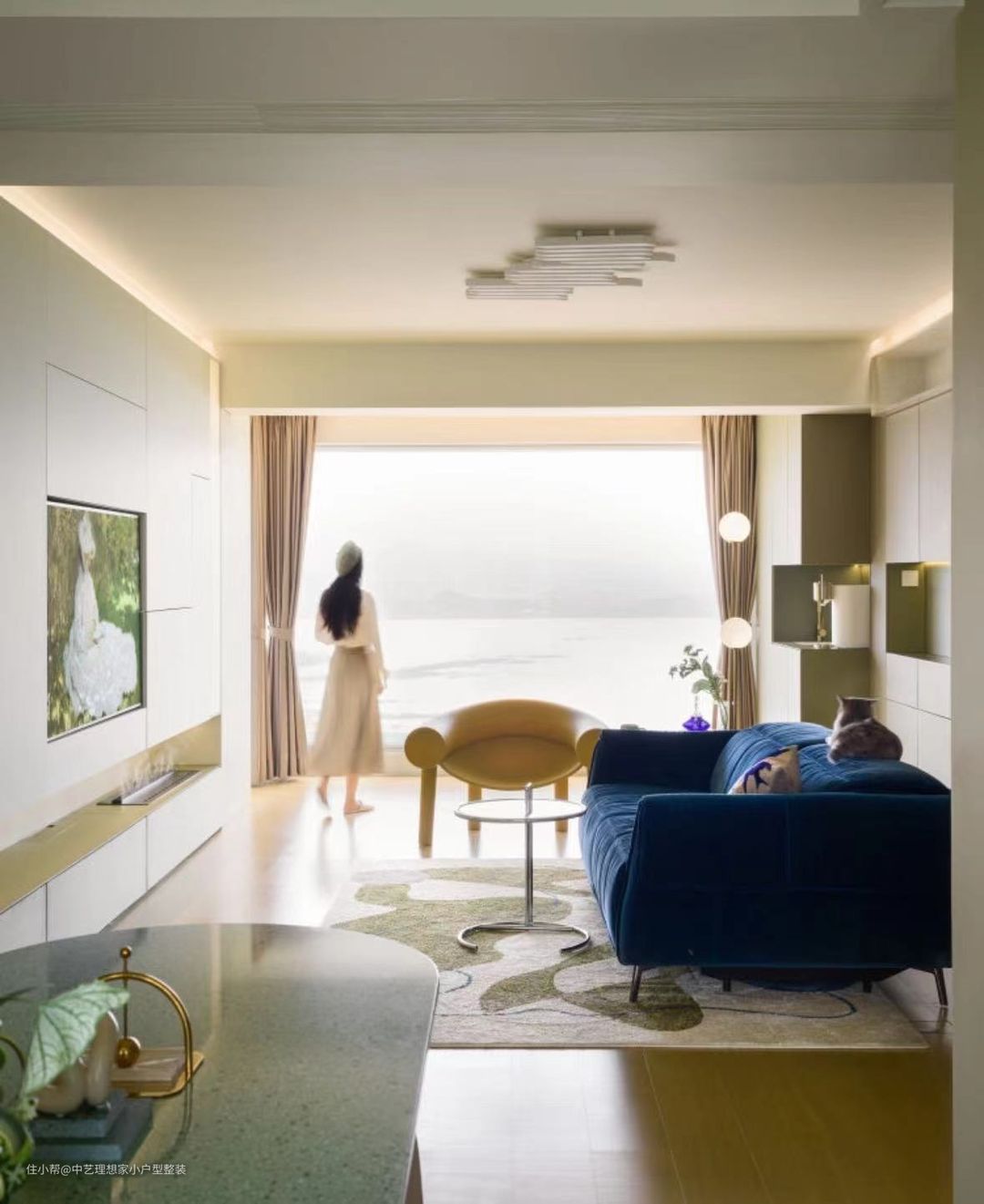 将外阳台纳入室内,安装整面落地窗实现大采光、大视野。客餐厅连通,横向长度达到13m,海景和落日晚霞可以尽收眼底。 ~ 收纳、隐形、宠猫三大超强核心在客厅体现得更为全面。