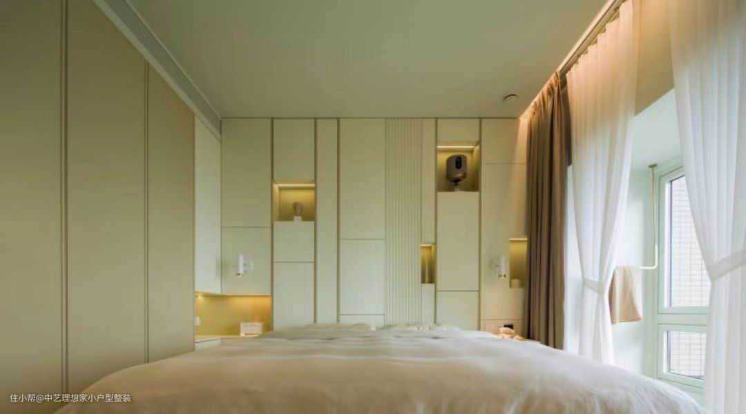 主卧背景墙是20cm深的薄柜,也是具备强大储物。左边是抽拉式隐形床头柜,右边是悬浮床头柜。天花加装了隔音层降低噪音,还具保温效果。