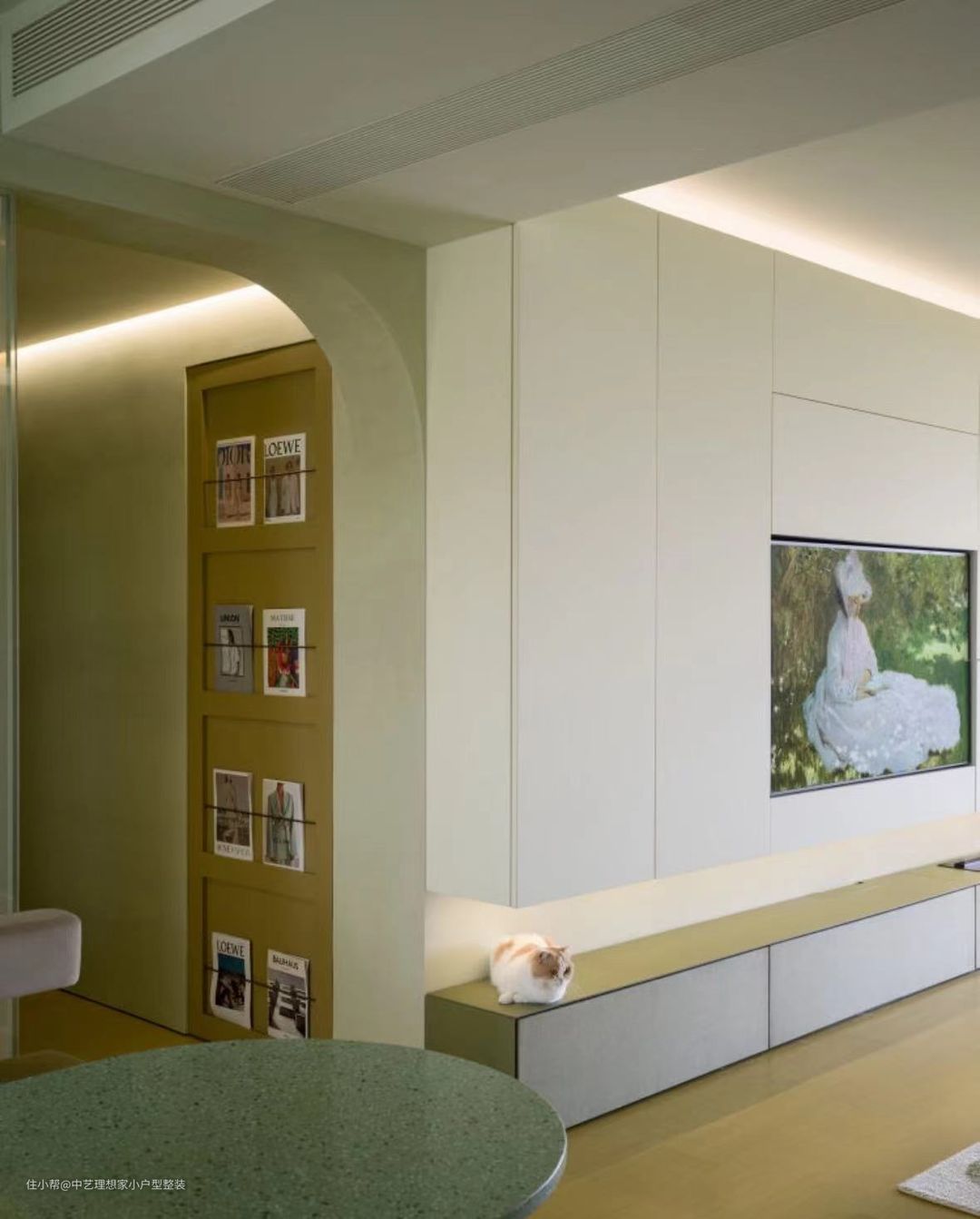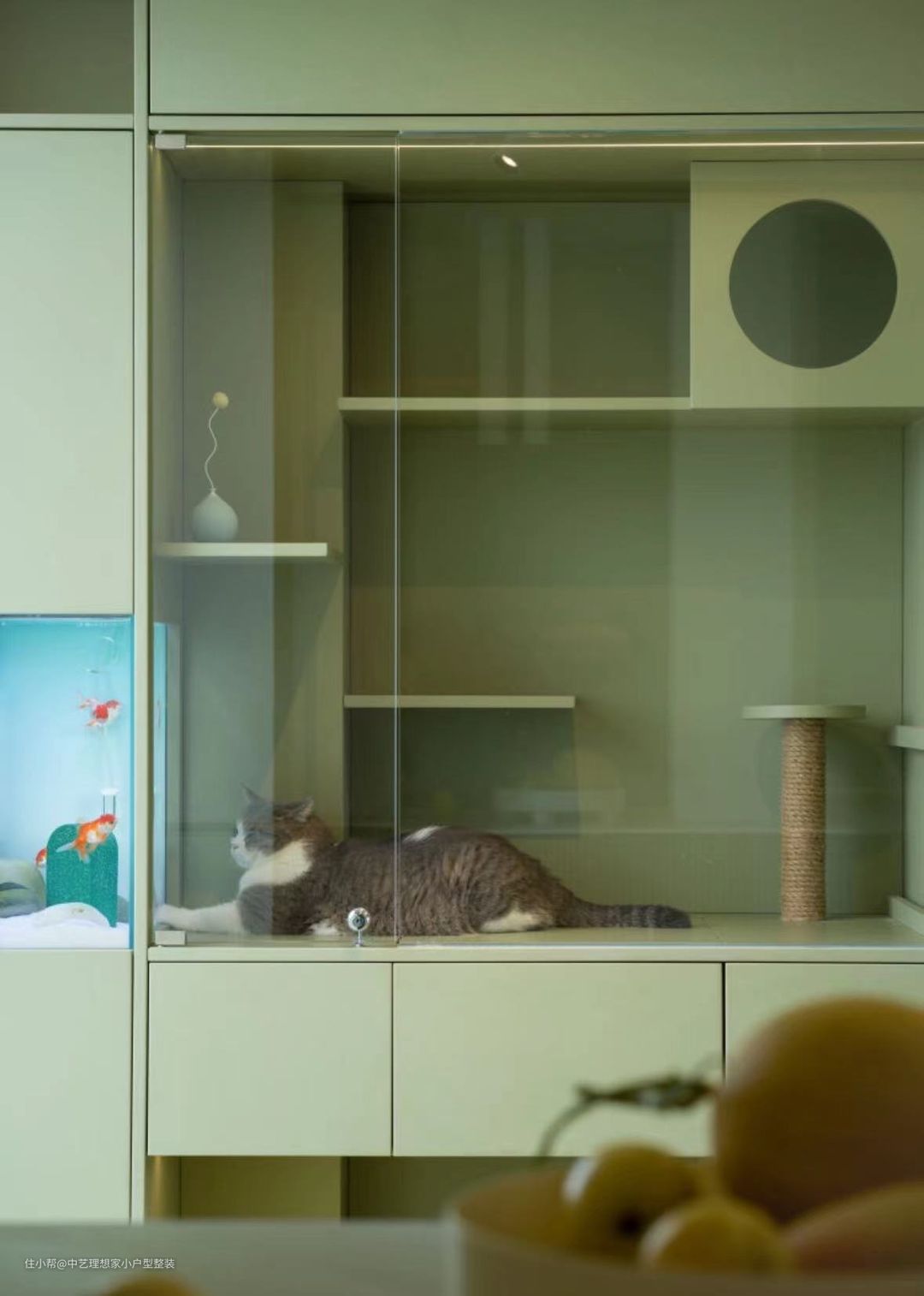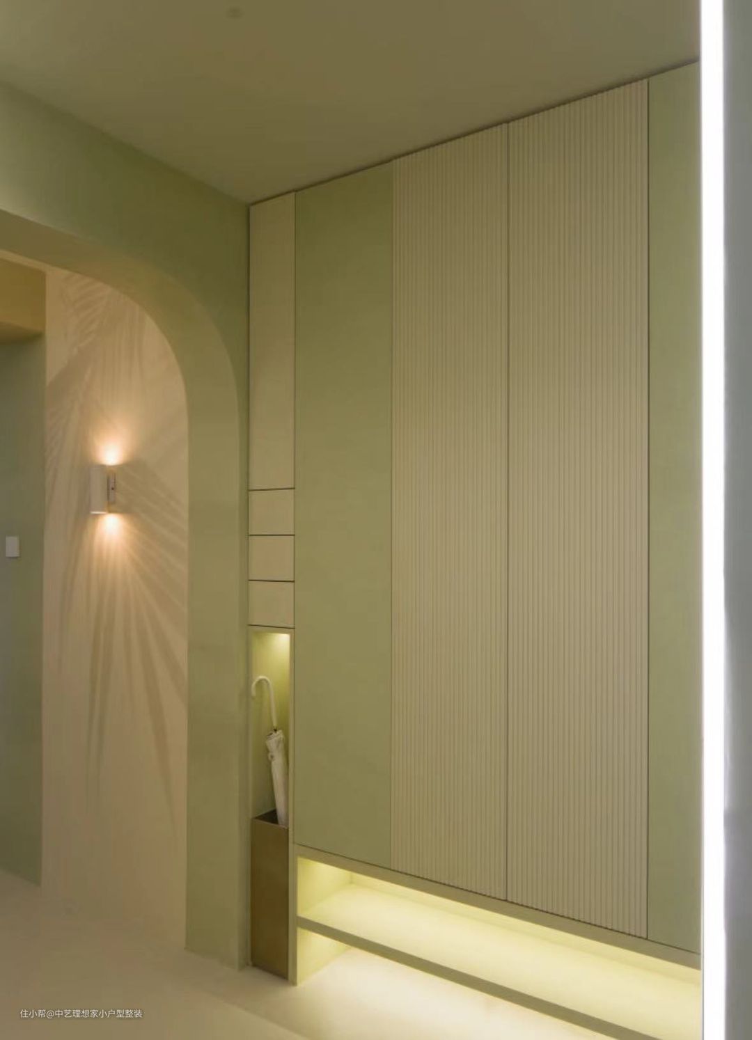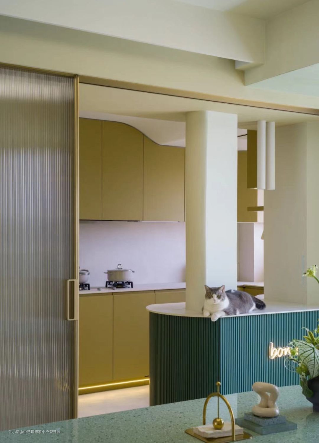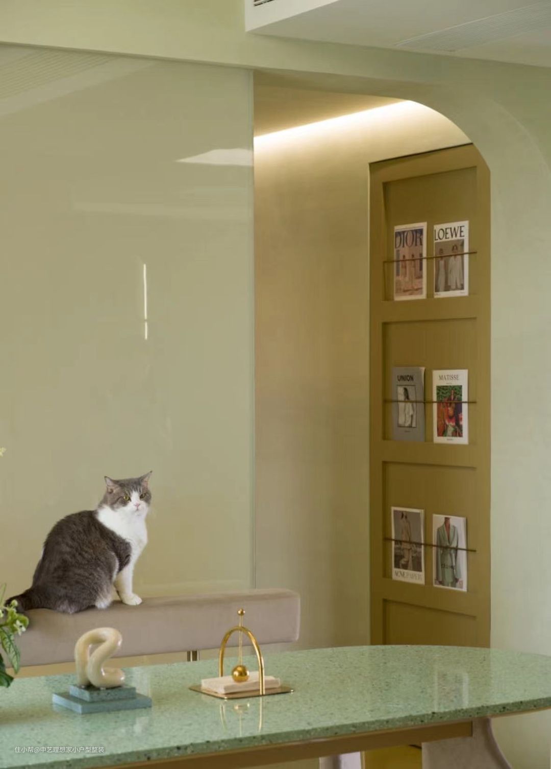 业主喜欢黄绿色系又带有小复古的风格,想要的空间调性也需要伴随着独特的个人特质。于是我将莫兰迪黄绿色用不同深浅呈现,且大面积地运用在空间中,再加以一些点缀色和绿植,让这个家有了清新治愈的主体感受。 但这不单单是一个简单、治愈的家。“超强收纳+隐形工艺+极致宠猫”,我总结出的这三点才是这家的“强内核”。 所以,现在,跟我一起探索这个家吧~