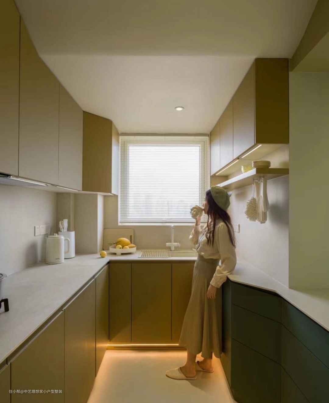 厨房是做的半开放,考虑到油烟,我们还是做了一个三联门,制造一个可开可合的空间。 顶部做了一个弧形的吊柜,因为原始结构的干扰,反而误打误撞的让那个地方成为了空间的亮点。 色系都是用到的柠檬黄,显得空间特别的统一,并且感觉做饭更加有食欲。