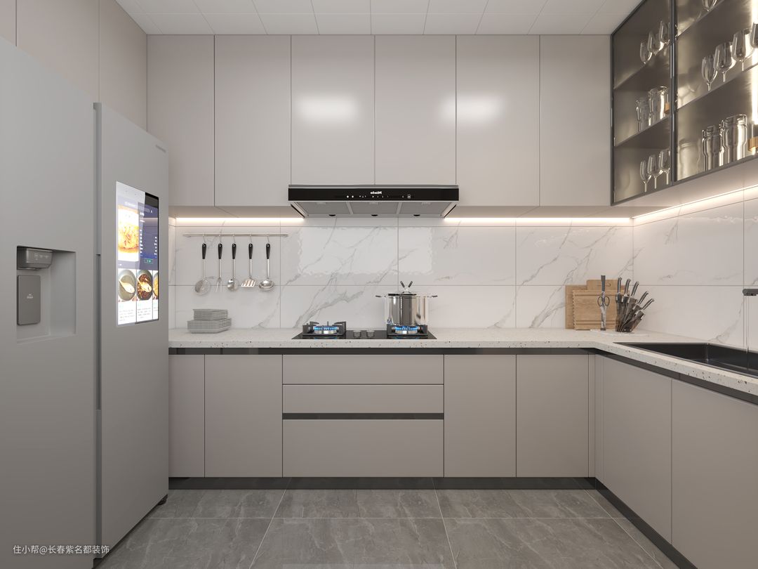 L字形的厨房布局,整体操作台面与空间都比较宽裕,可以同时容纳多人在此配合烹饪,共处的时光温馨、甜蜜
