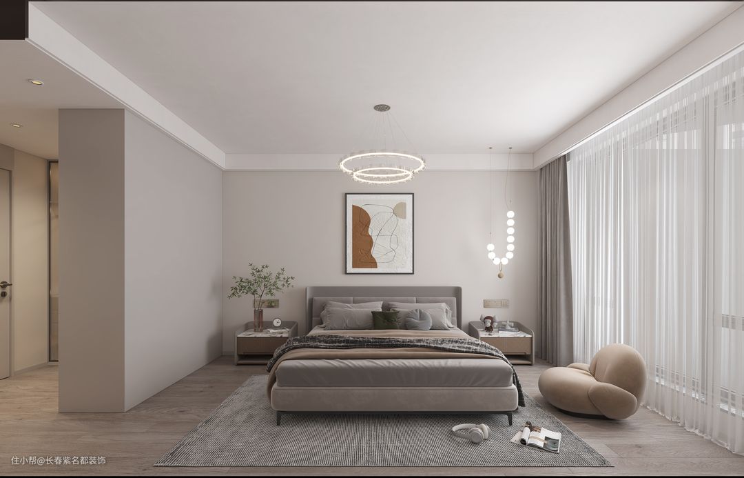 白灰相间的窗帘,同色系的真皮床,用一抹棕色的亮丽,体现着主人的文化品味