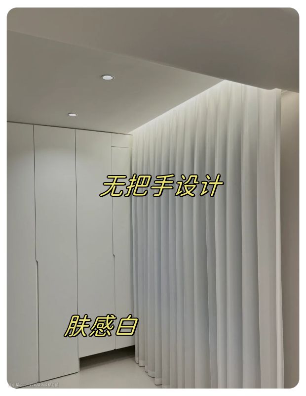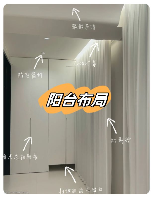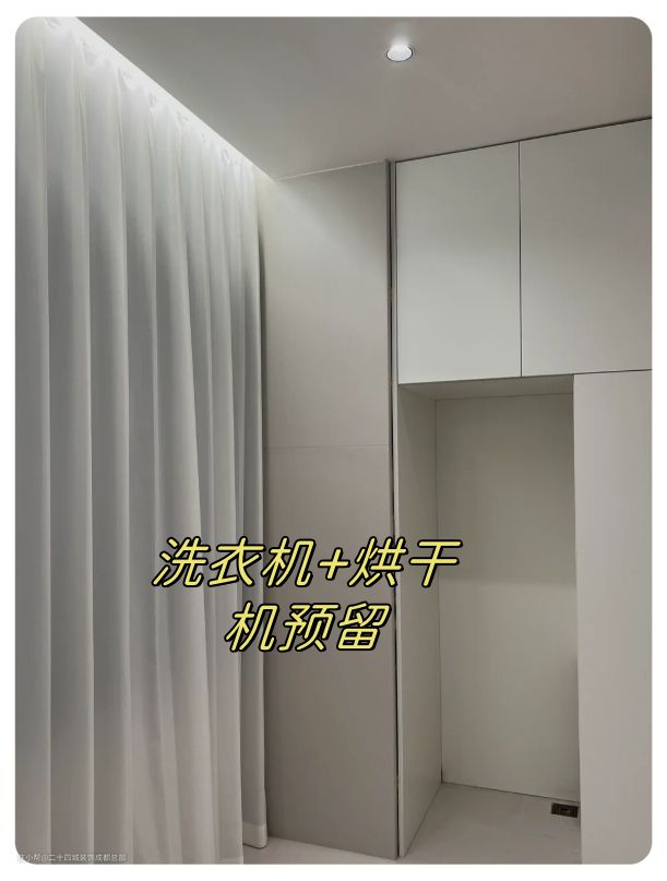 弧形吊顶使阳台看起来更加柔和,与周围的自然环境融为一体,凸显了生活环境的温馨和舒适。侧面预留的窗帘盒使得光线得到了更好的遮挡,选择幻影纱作为窗帘,既能透光又能保护隐私,非常适合阳台使用。 两组柜子提供了大量的收纳空间。大柜子用于存放换季的衣物和鞋子,小柜子则预留了洗衣机和烘干机的位置,方便快捷。柜子下面还预留了上下水和插座,以方便未来安装扫地机器人,为清洁工作提供了便利。