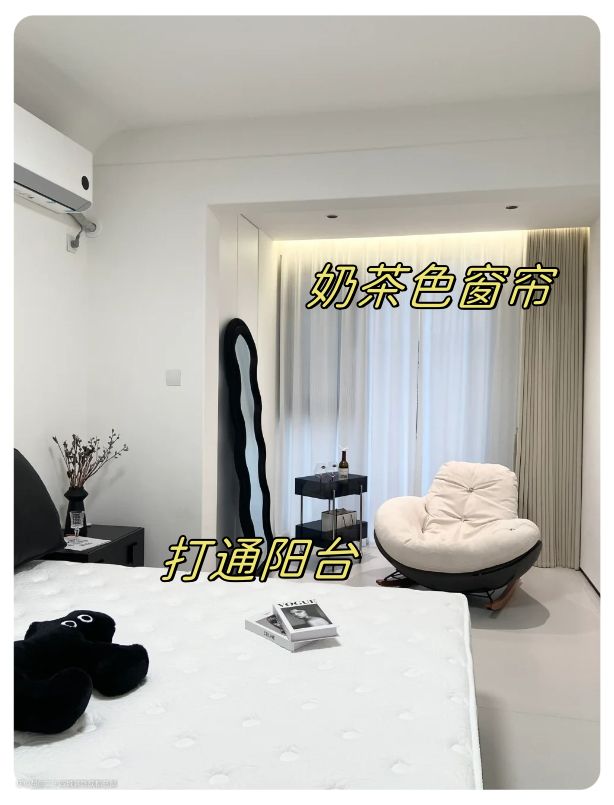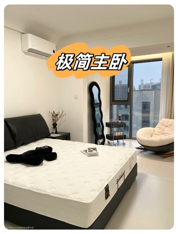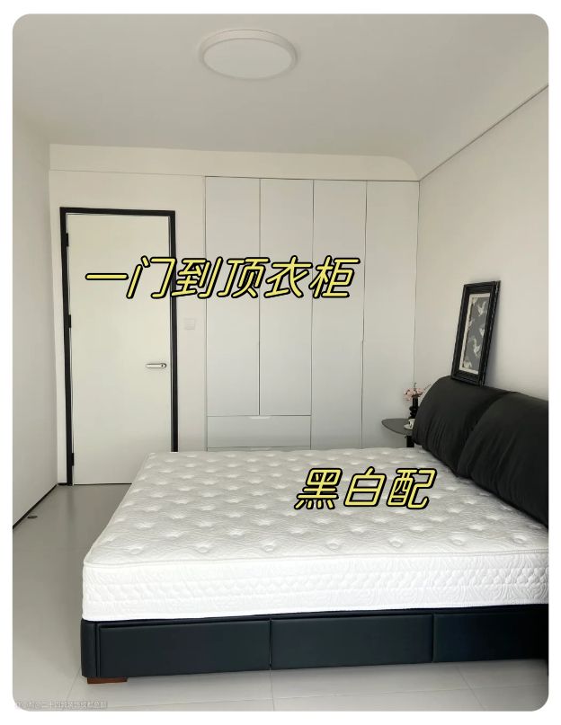 现代简约风格的床架,搭配黑色皮质床头柜,精致美观,也便于清洁。床品选择了轻盈透气的棉麻材质,能够为卧室增添一丝舒适感。 衣柜选择了白色简约设计,便于清洁,同时也能够与床头背景墙形成统一。衣柜内部设计有不同大小的抽屉和隔层,方便收纳不同种类的衣物和配饰。