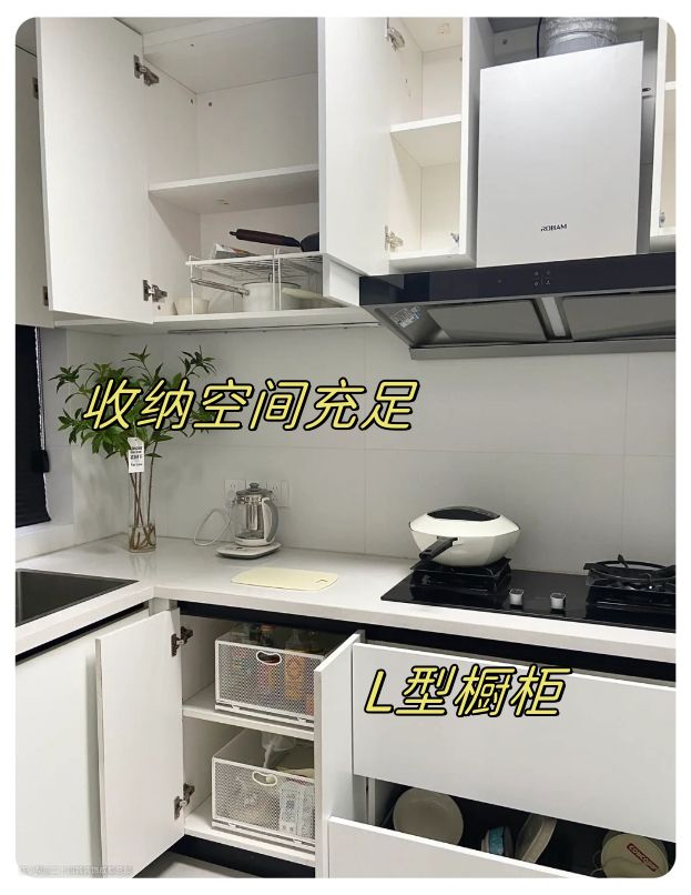 采用L型设计,白色为主调,使小厨房显得不压抑。橱柜整体设计注重实用性和美观性的结合,充分利用空间,合理分区,使厨房整洁有序。 台中盆大单槽和无挡水条设计,美观且易于清洁,无卫生死角。台面下挂1.5公分,方便操作。地柜高度设定为85公分,符合人体工程学,方便日常使用。