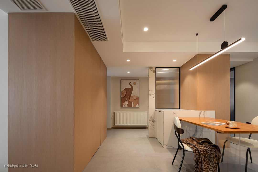 设计师索性利用柱子本身,将其打造成多功能中岛柜,宛如盒子状的中岛台,既是隔断,也是家政柜,兼具美观与实用性。