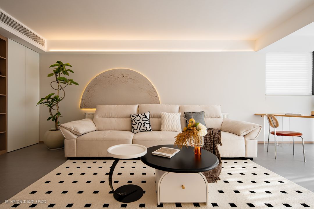 沙发背景墙造型遵循大道至简的设计理念,半月形的墙面装置搭配元气绿植,顿生出几许空灵侘寂的意味。