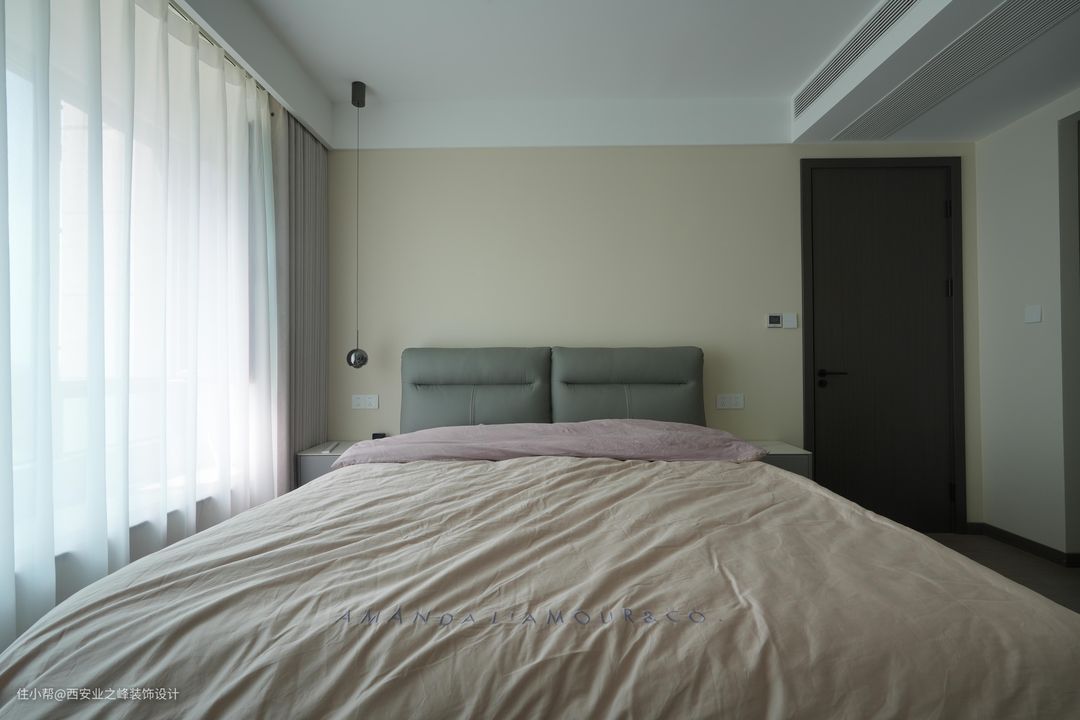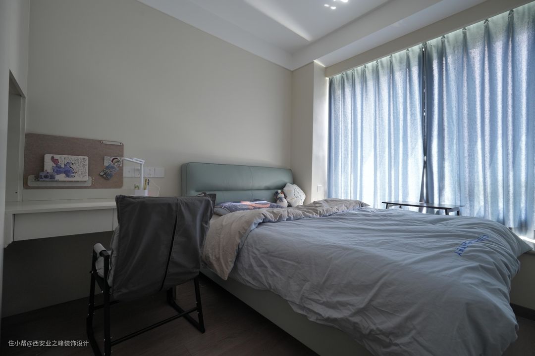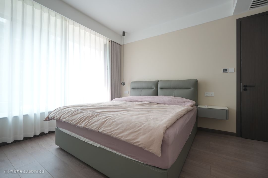卧室更加注重舒适性和私密性。我们用的木地板作为地面材料,看起来温暖舒适,而且有跟好的隔音效果。墙面用了中性色调,搭配简约的床品,营造一个宁静的休息空间。床头背景墙的设计简单精致,增加层次感。