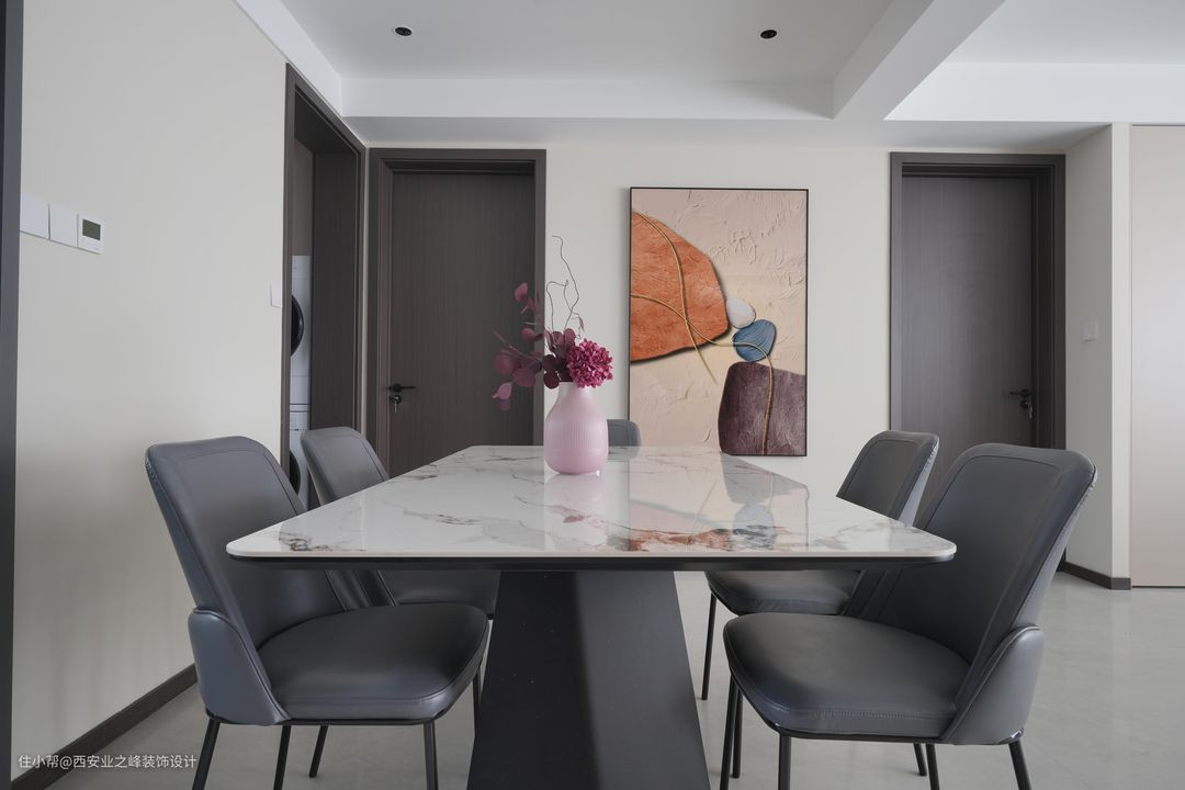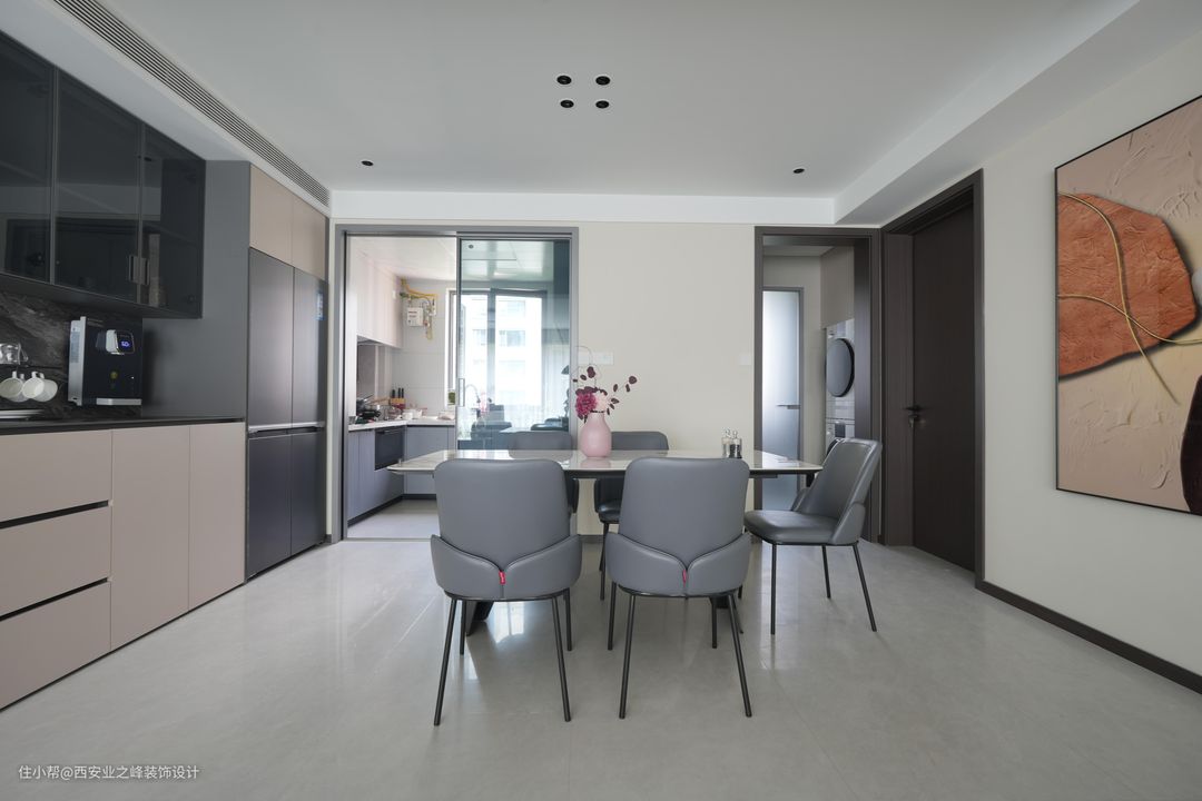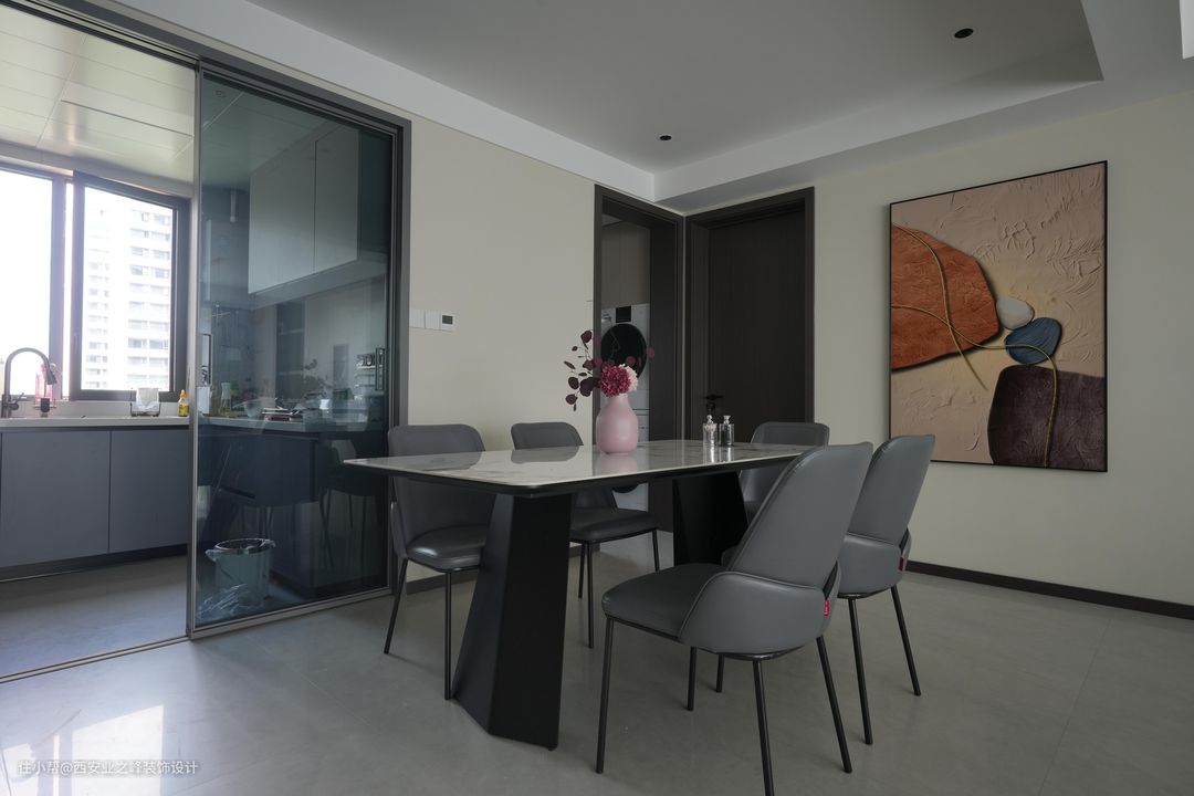 厨房和餐厅是相连的,我们在这里延续了简约的设计风格。餐厅和客厅一样大地砖通铺。为了增加餐厅的艺术气息,我们在墙上挂了精心挑选的挂画。营造出一个温馨的用餐环境。