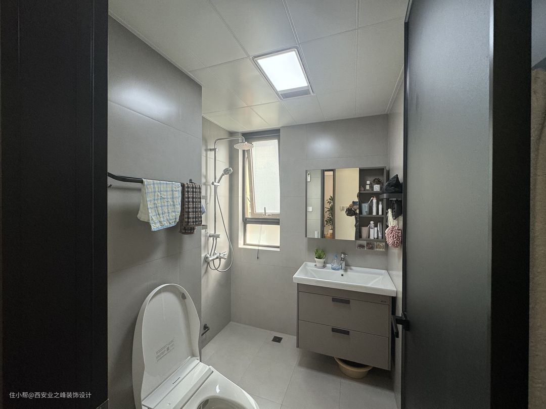 卫生间面积不大,我们用的简约大墙砖,保证实用性的同时打造出来大气的效果,跟别的空间保持一致。
