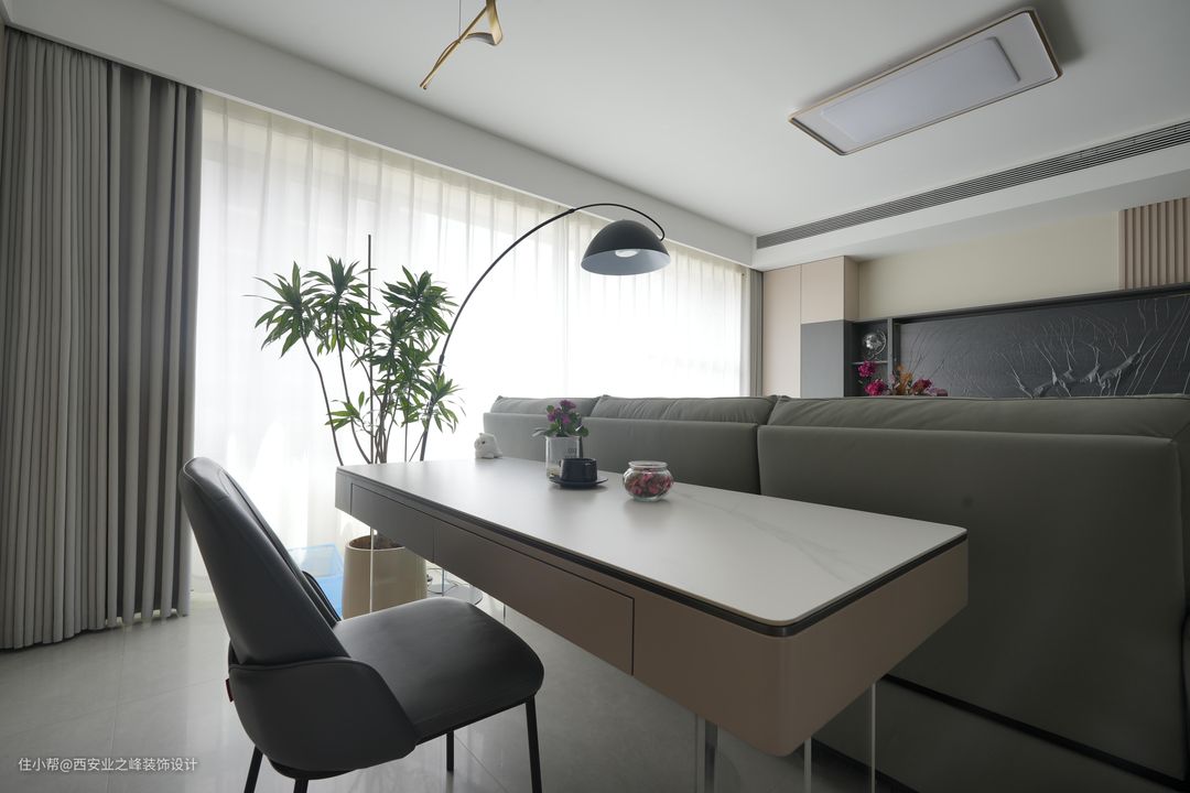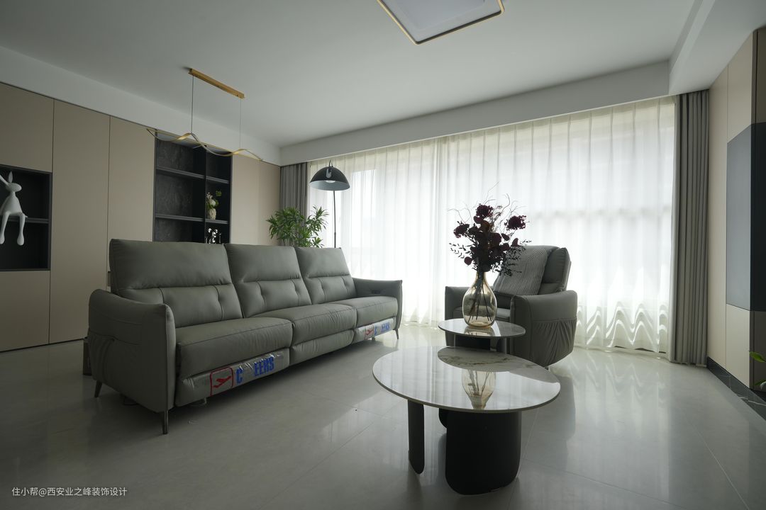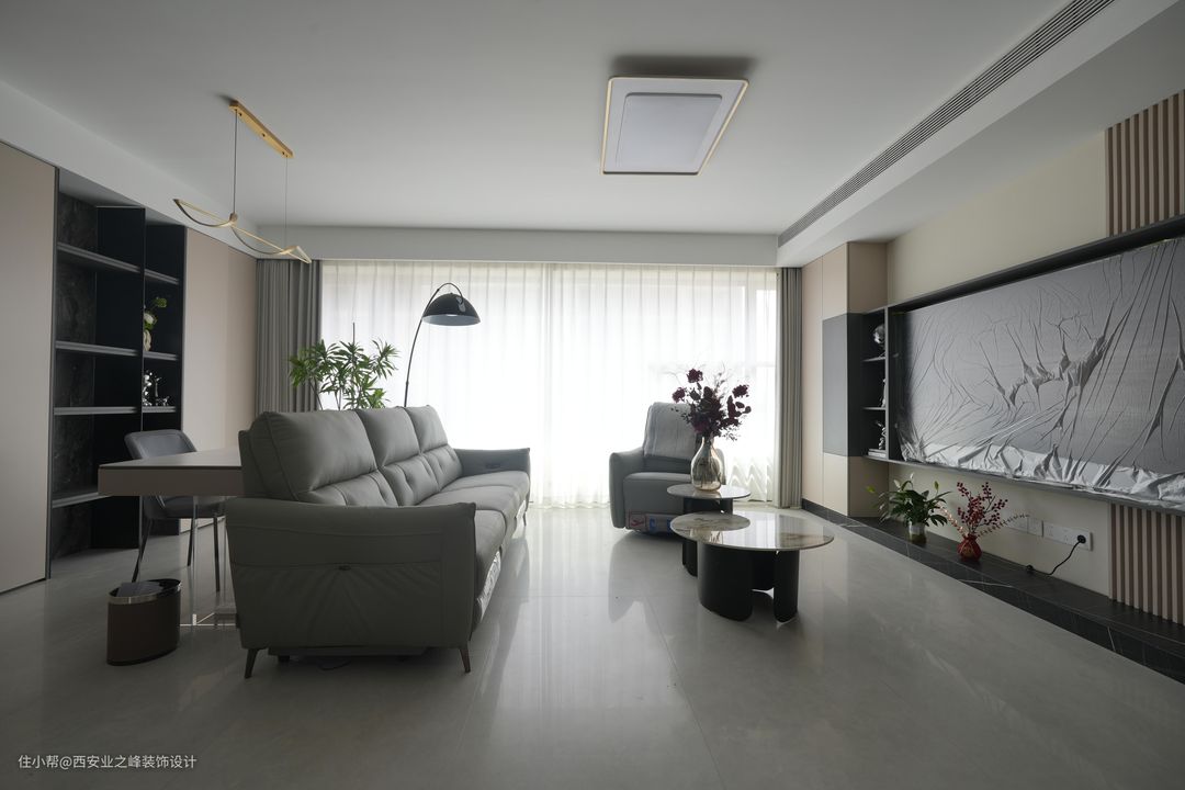 客厅我们选择的是750*1500的大地砖作为地面材料,耐磨耐用,而且易于清洁,适合现代生活的快节奏。吊顶设计简洁大方,没有过多的装饰,保持空间的纯净和开阔感。沙发背景墙做了一组相互搭配的定制储物柜,搭配简约的家具,营造出大气的氛围。