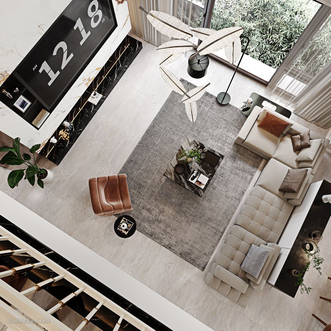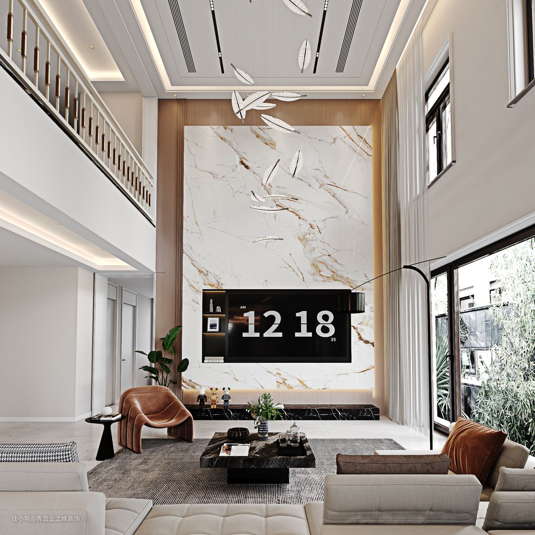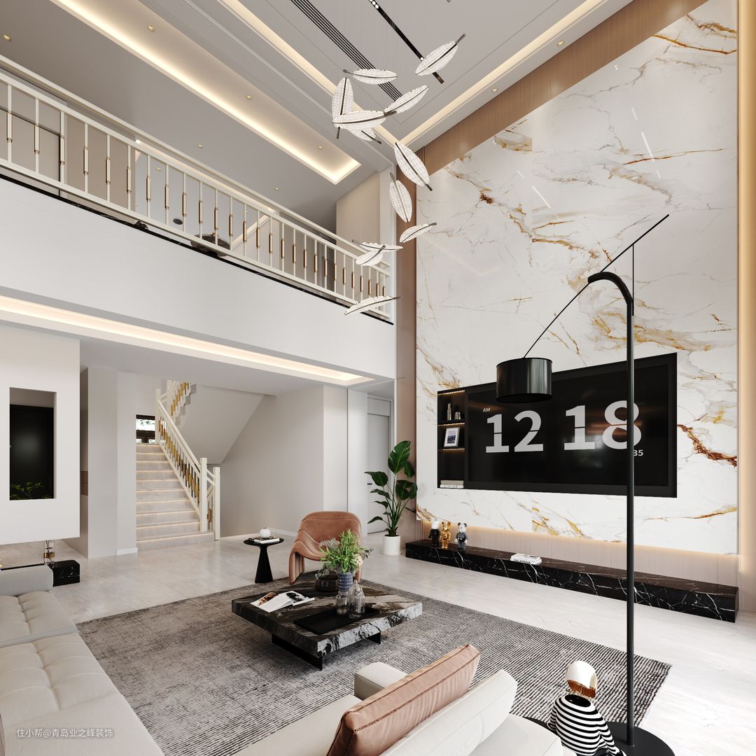 电视背景墙墙上铺贴了一整块潘多拉花纹的大理石瓷砖,搭配灰色地毯, 米白色沙发,布置黑白配的石材台面茶几,显得更加现代舒适。客厅采用挑空设计,造型优雅的灰色沙发上摆放着多个靠枕,宽大的液晶电视嵌入背景墙里,设计精美的吊灯就像晶莹剔透的蒲公英一样。