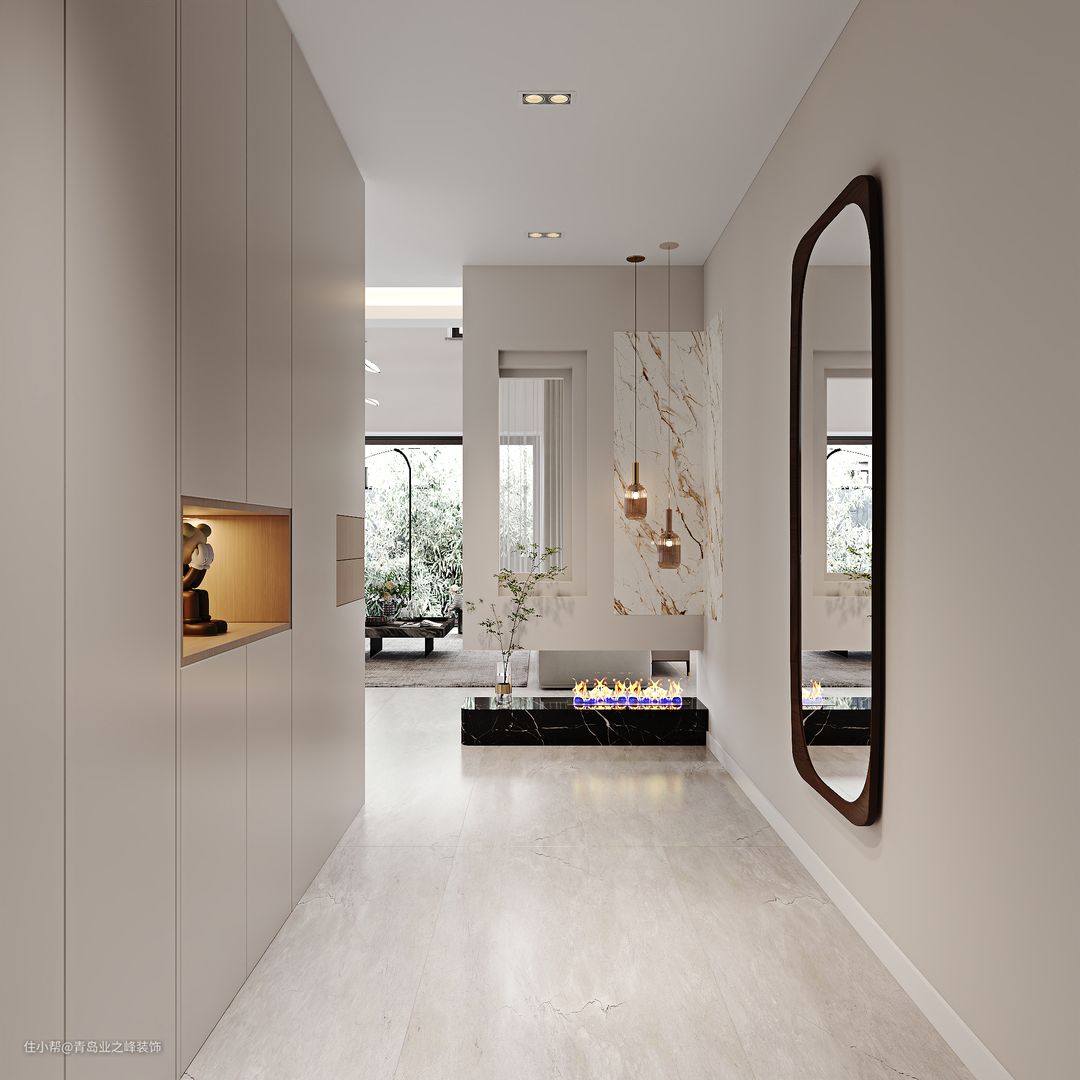 步入玄关,墙面造型上以白色色调为基准,结合纹理技法,摆脱了单色地面的单调,勾勒着空间与时间同在的共时性。简洁的白色背景与潘多拉纹大理石的结合,凸显希望与自由的设计风格,又有现代艺术装置的加入,更提升了整个空间的调性和完整性。