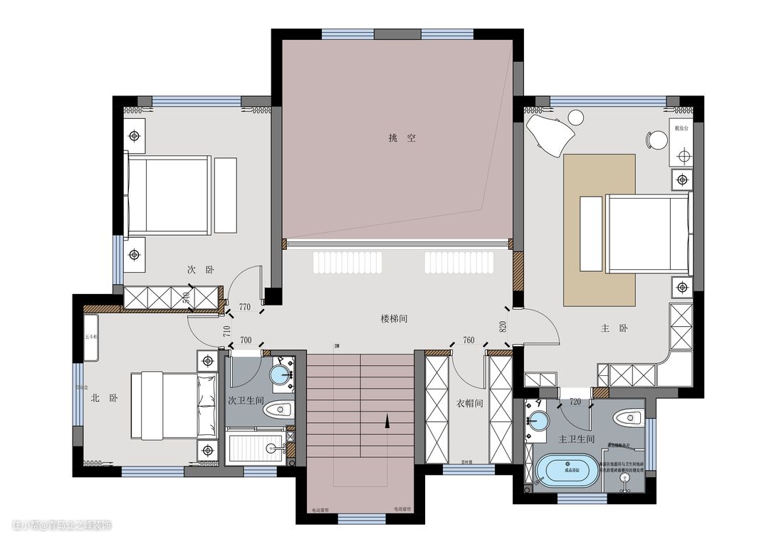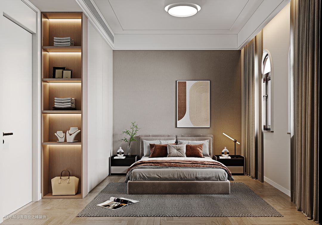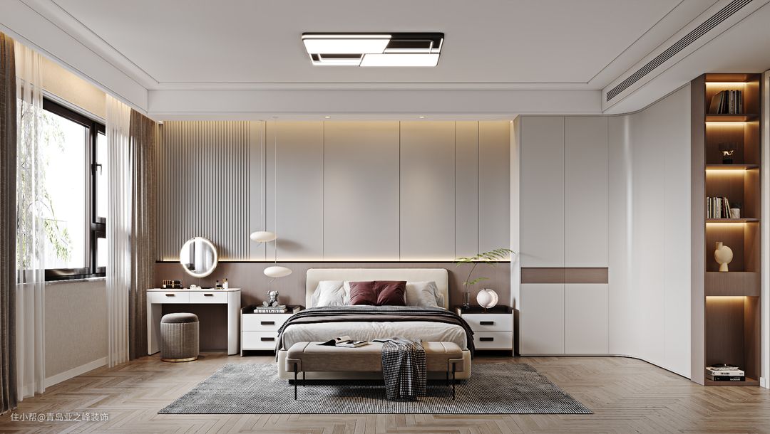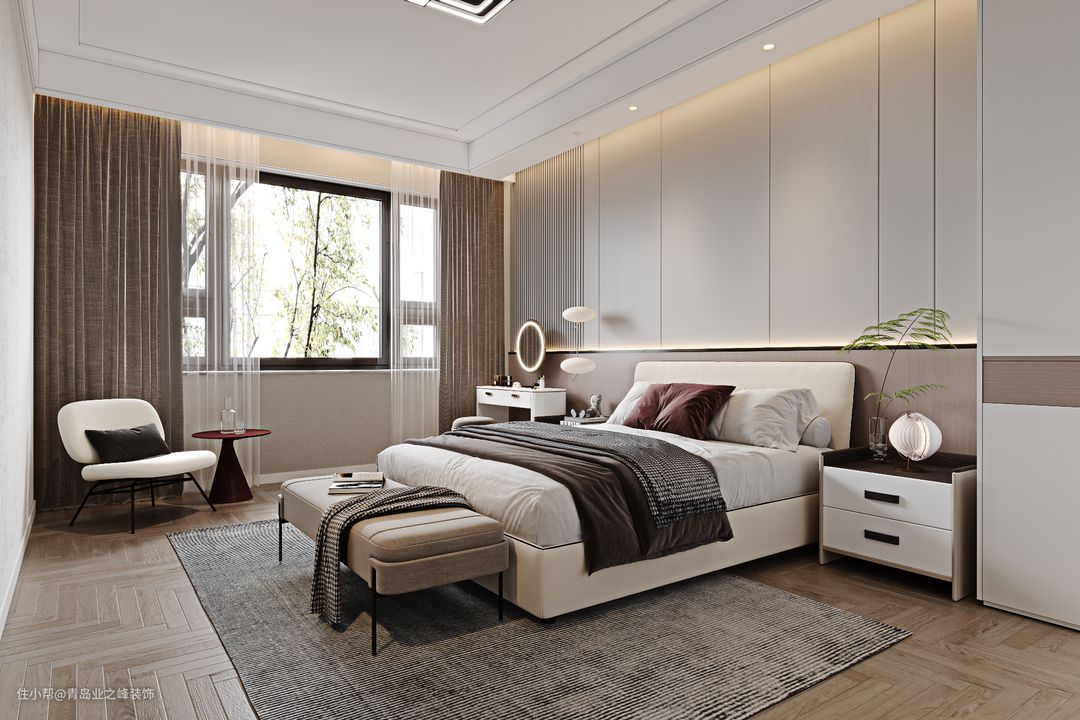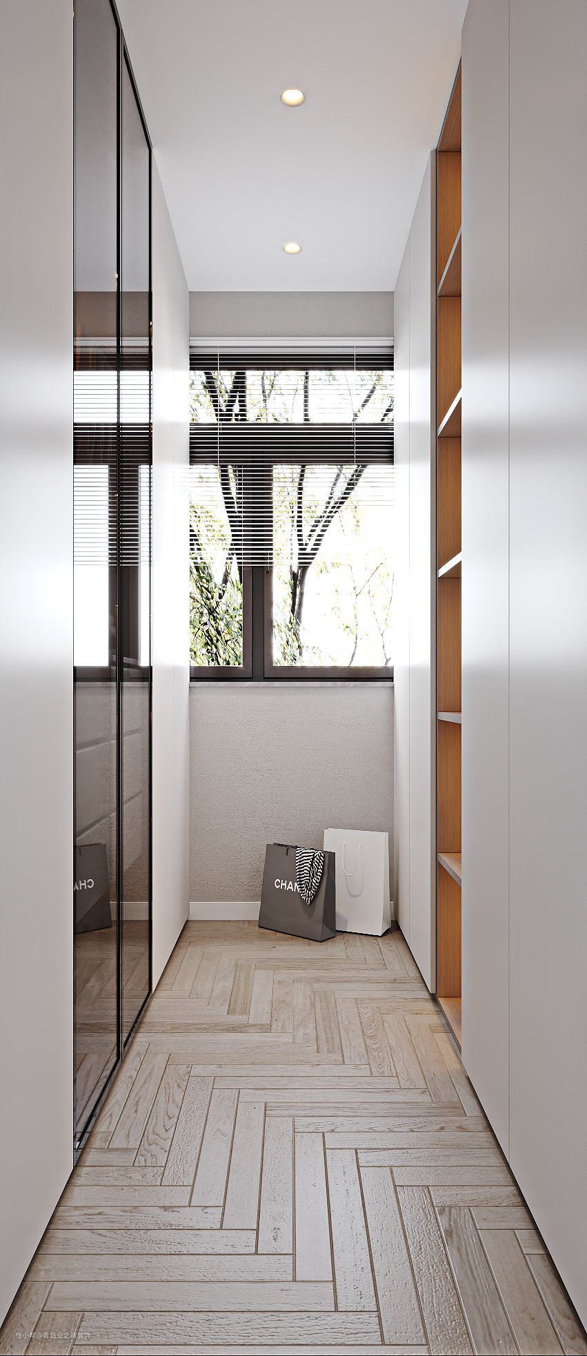 在卧室的设计上,强调的是舒展与放松,没有刻意的豪华,但流露出精致的生活情调。柔和的暖白色调, 为衣橱空间设计增添了人文气息,创造了存储空间的同时,让空间氛围达到沉稳而美妙平衡。