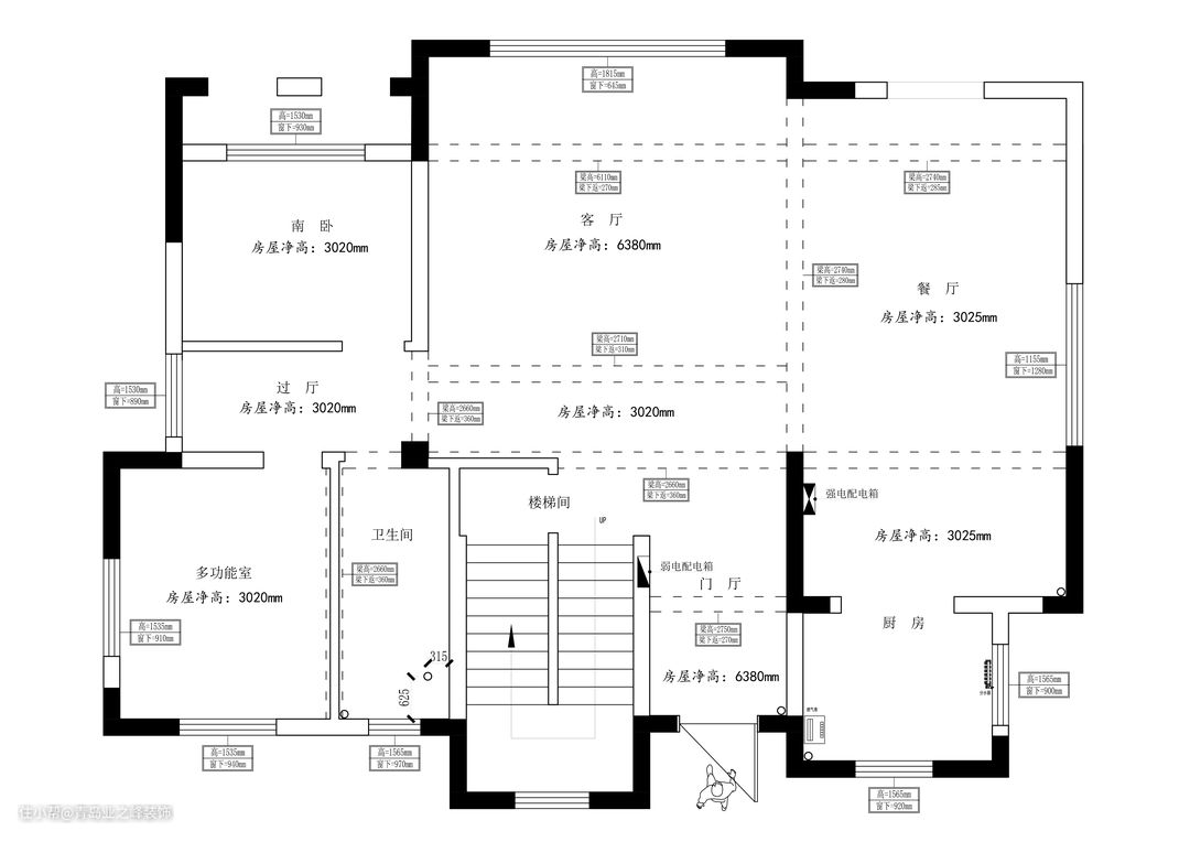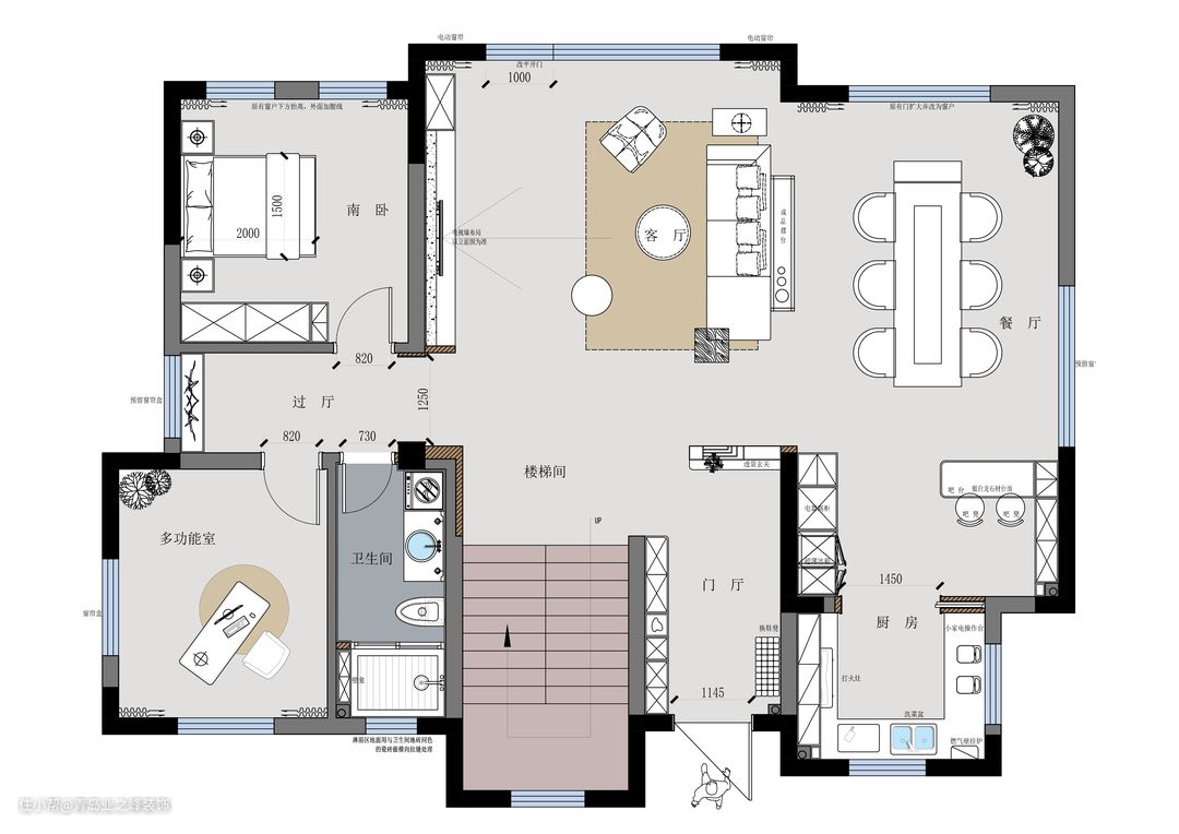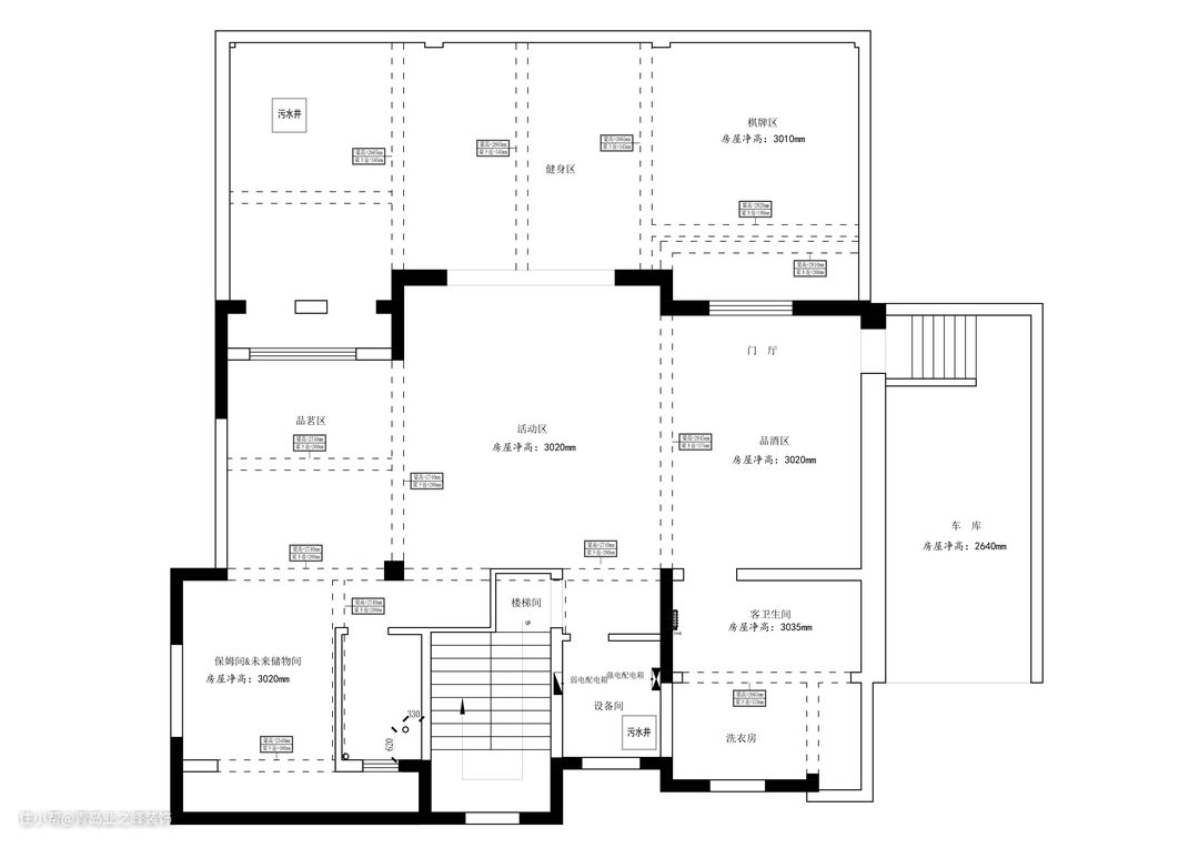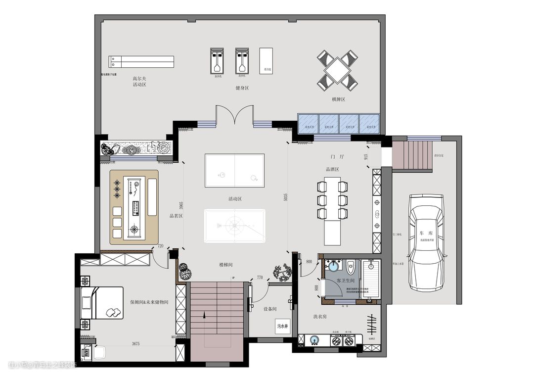 户型优缺点分析: 问题1:入户无玄关遮挡,隐私性较弱。 解决方案:增加入户玄关墙,起到室外到室内的缓冲作用,在视觉上增加私密性和隐蔽性。 问题2:厨房面积过小。 解决方案:在餐厅区域增设西厨,很好的避免了油烟,增加烹饪的空间。丰富居家生活多样性,完美的实现了中西分厨。 问题3:无家政空间。 解决方案:负一增加洗衣房,更好的提高生活质量,可以起到节约空间的作用,将家里所有清洁工具都收纳在一个空间内,让家变得整洁有序。