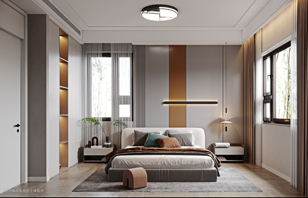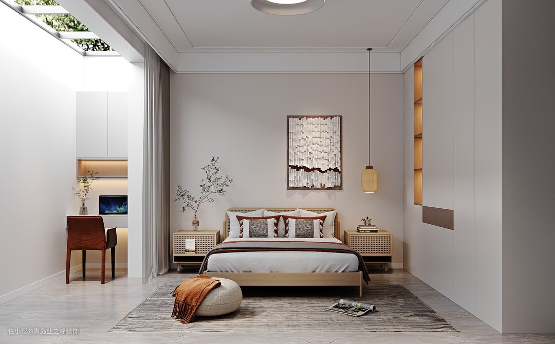 卧室床头柜没有多余的装饰,设计巧妙的垂线吊灯悬在床边,室外的光线透过玻璃窗洒进来,达到和谐统一。格调灰的高级感、以及自然的生机,抒写了居者平和宁静的心境和高雅的艺术追求。