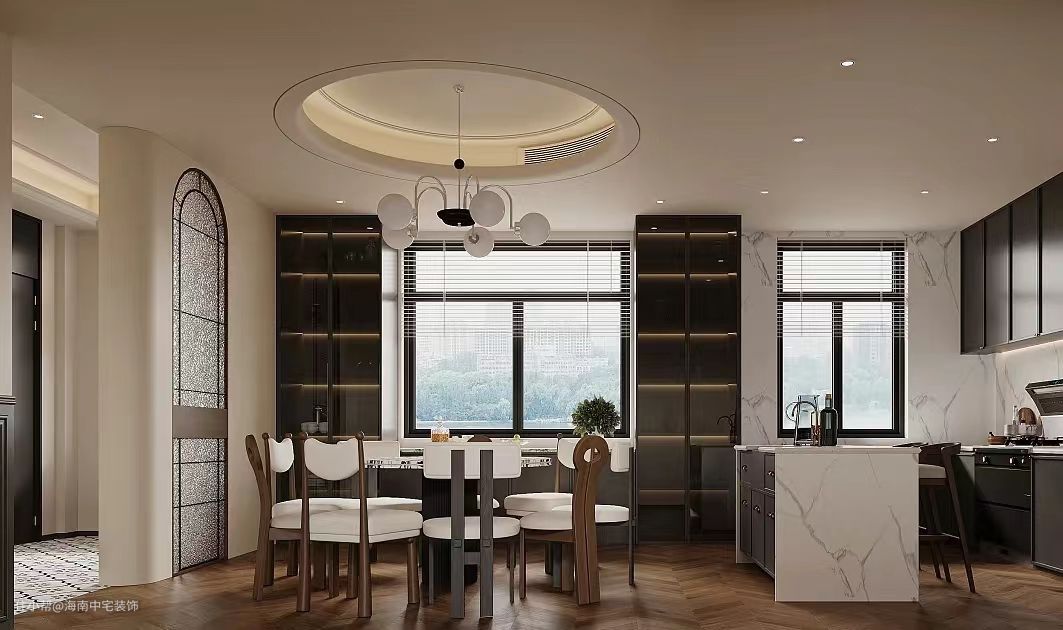 与客厅保持统一风格,选用简约风格的餐桌和餐椅。在餐桌上方悬挂一盏法式风格的吊灯,为用餐时光增添浪漫情调。墙面可设置置物架,摆放一些法式风格的装饰品,提升空间美感。