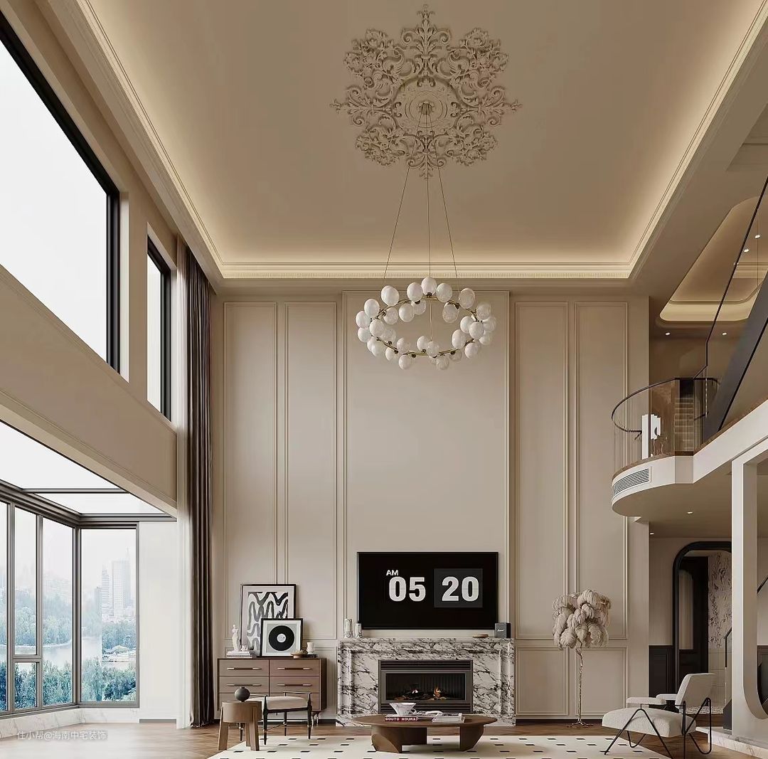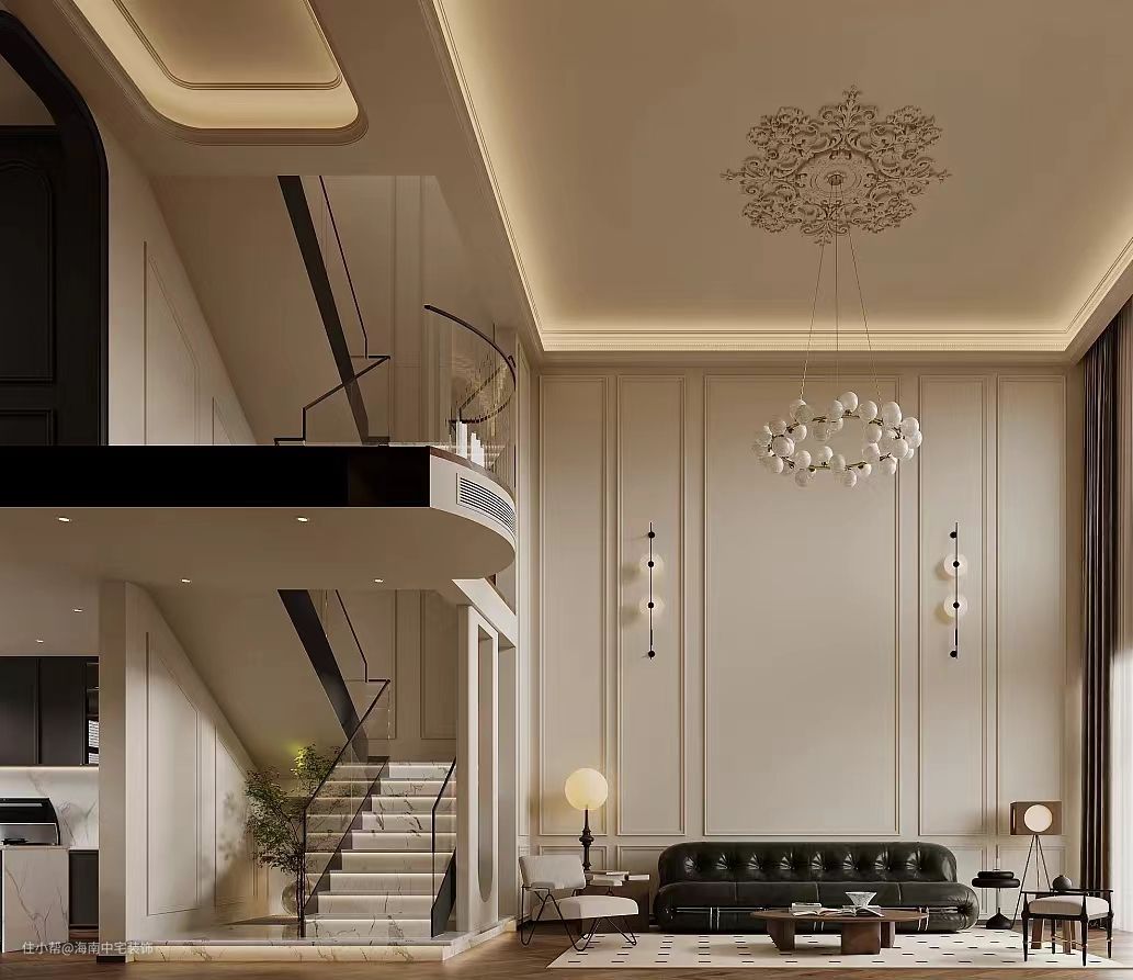 采用开放式布局,增强空间感。选用简约风格的沙发、茶几和电视柜,搭配法式风格的窗帘、地毯和壁灯,营造浪漫氛围。搭配木质地板,营造出自然、舒适的感觉