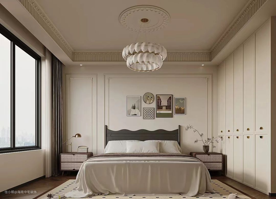 以简约舒适为主,选用舒适的床品和简约风格的床头柜。墙面可采用淡雅的色调,搭配法式风格的壁纸或装饰画,增添空间的艺术感