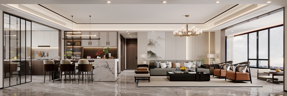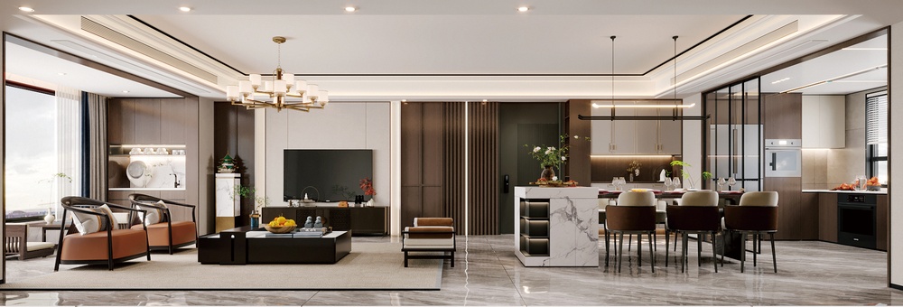 ▲ 客厅全貌 整体色调:胡桃木色+奶咖+灰调 瓷砖通铺、整体吊顶,顶地面形成一体感,加上开放式厨房,整个餐厨客阳台更加通透宽敞。 大平层的视觉感、优越感得到最大的释放!