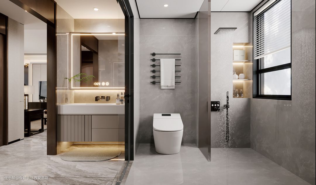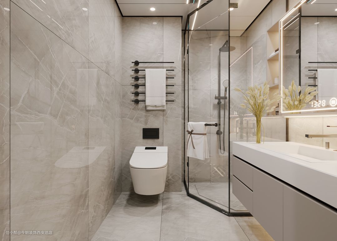 ▲ 女儿房 做了点光源分散设计,满足不同时间段对灯光的不同需求,暗卫是这个房间的弊端,做了双排气+电热毛巾架设计,保证空间干燥。