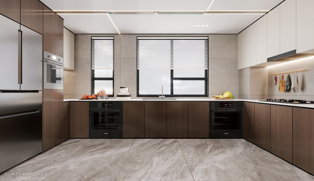 U型厨房设计,宽敞的操作台、嵌入式冰箱,使用跟功能上足以满足三口之家的日常使用。