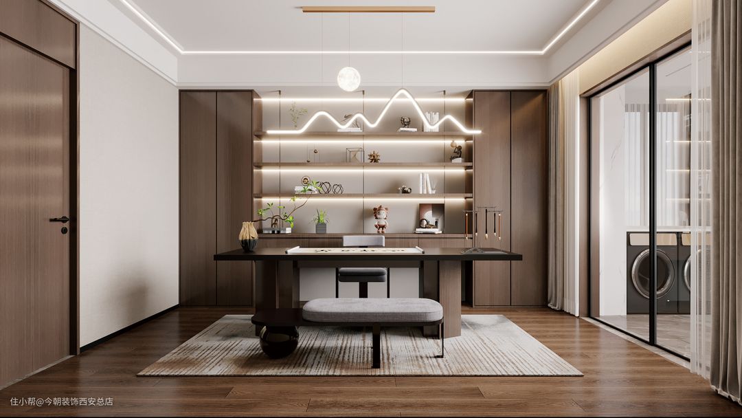 ▲ 书房 这里作为全家的办公、阅读区,整墙的书架是标配,双向办公桌椅更好的满足需求。