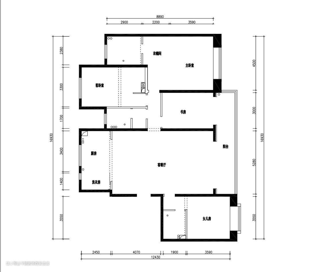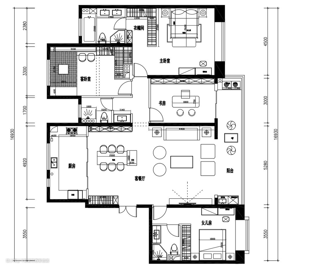 ▲ 重新布局 ❶ 三个朝南的卧室分别做主人房、女儿房、书房,北向卧室做储物+临时客卧; ❷ 公共区域收纳统一集中到餐厅+阳台位置增大客厅的活动区域; ❸ 客卧作为临时所用稍显浪费,做背靠背衣柜,匀一部分空间给主卧; ❹ 餐厨做LDK设计,四联动推拉门实现开放式厨房要求,通风采光更加完美。