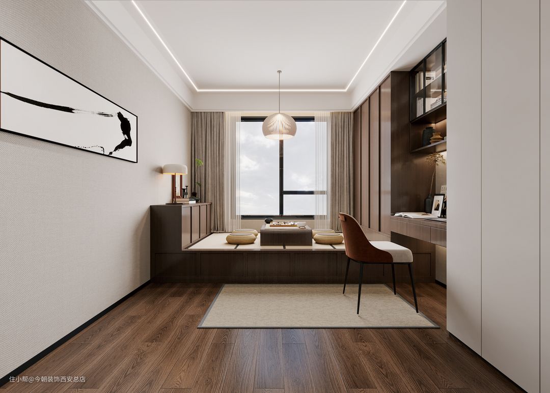 这个房间日常作为收纳不常用的物品,偶尔来客做临时住宿,也是另一个书房的形式。设计了舒适的榻榻米,足够容量的收纳柜,以及临时办公或者看书的设计。