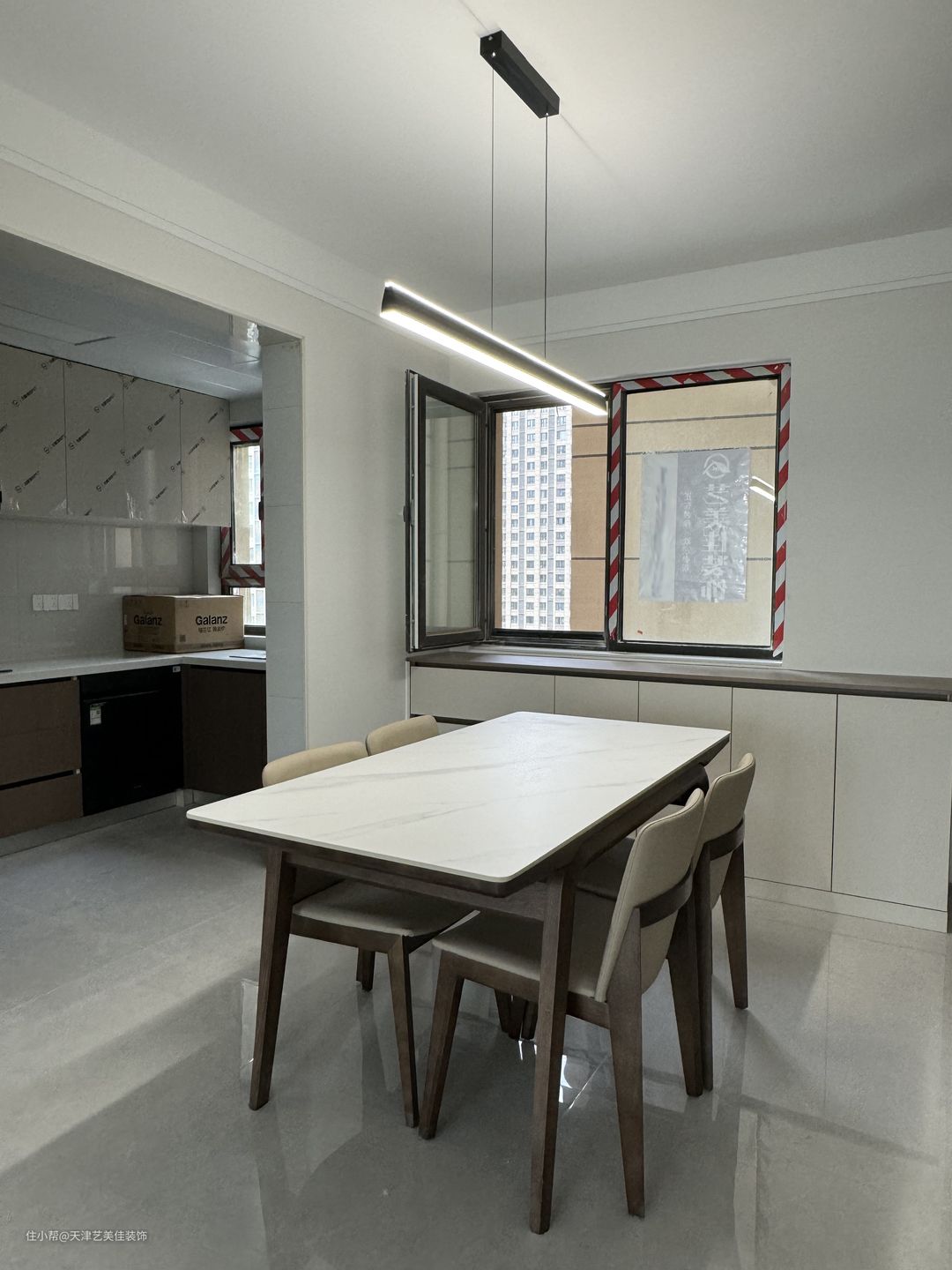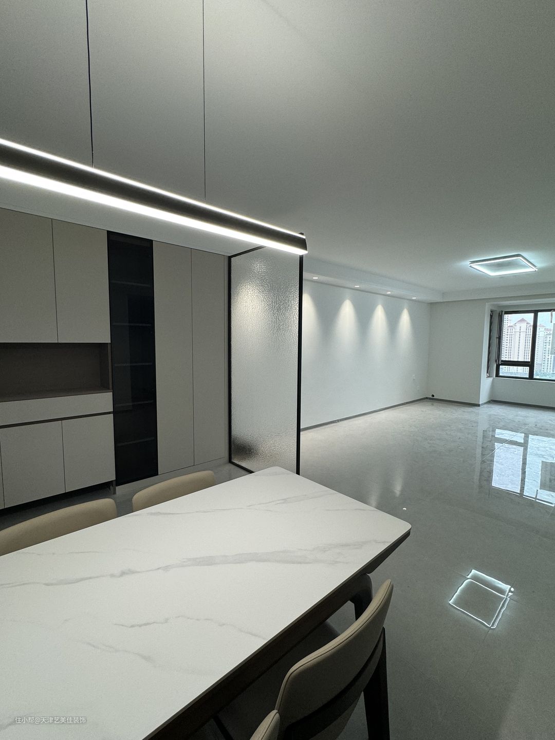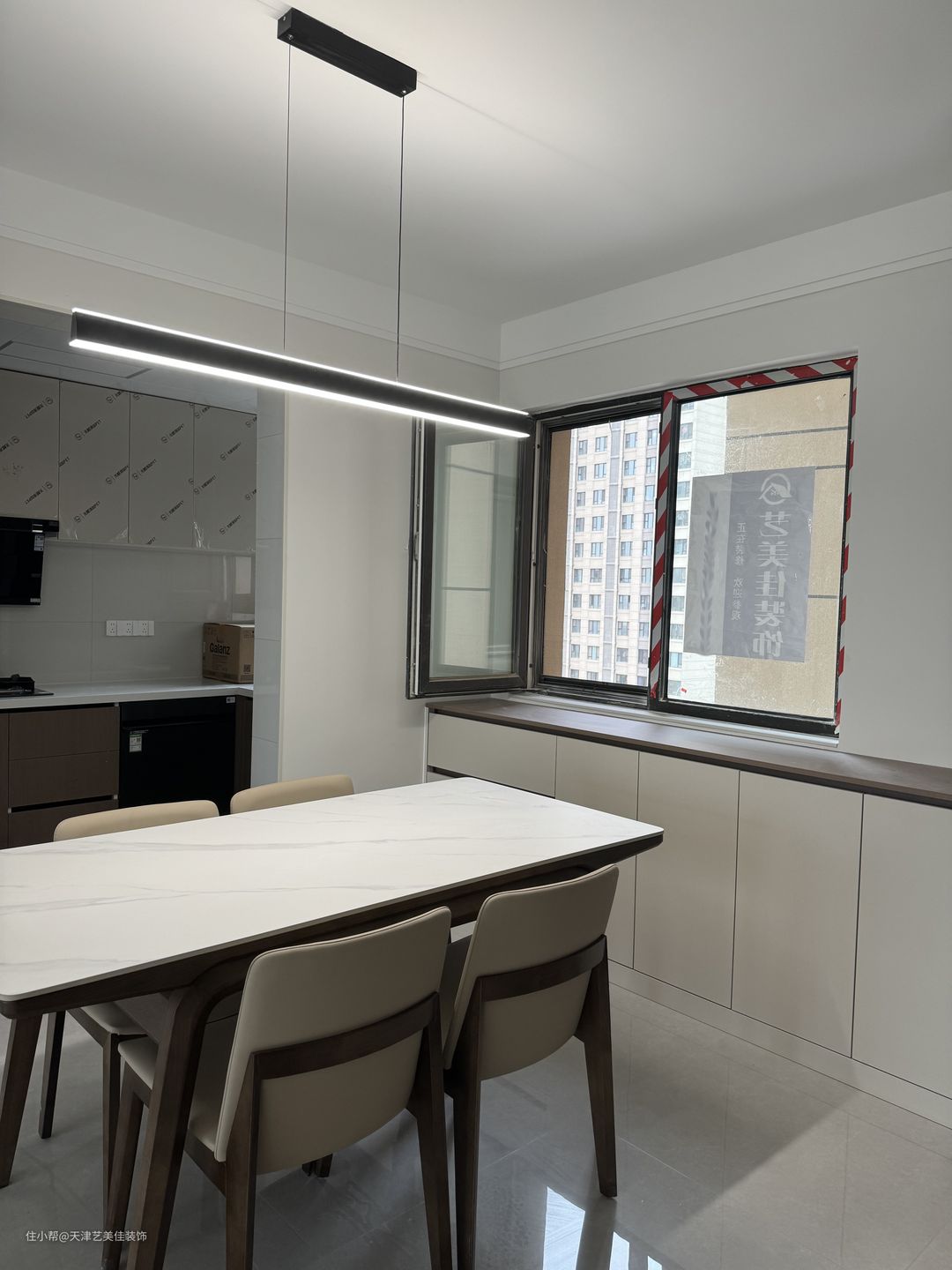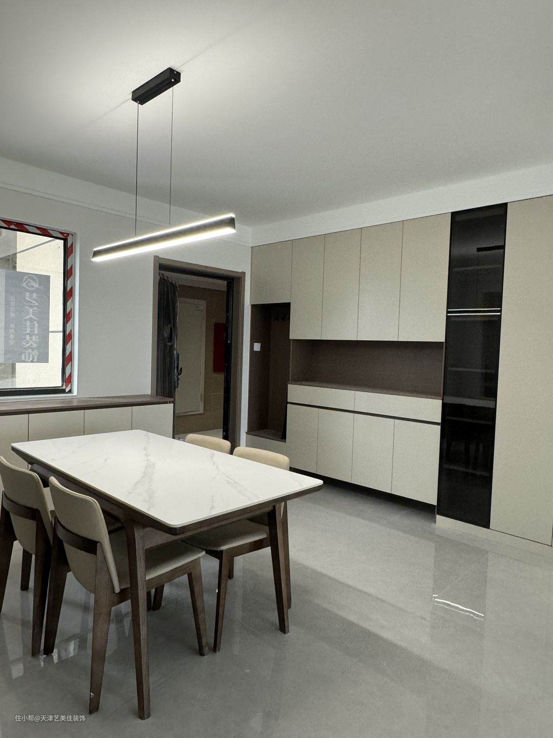 岩板餐桌搭配4人座餐椅,满足一家人就餐,简约的小吊灯,增加餐厅的氛围感,从户型上看,是没有餐边柜的位置,设计师在靠窗的下边做了一排地柜,满足收纳。
