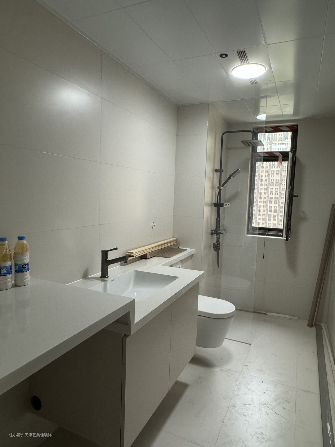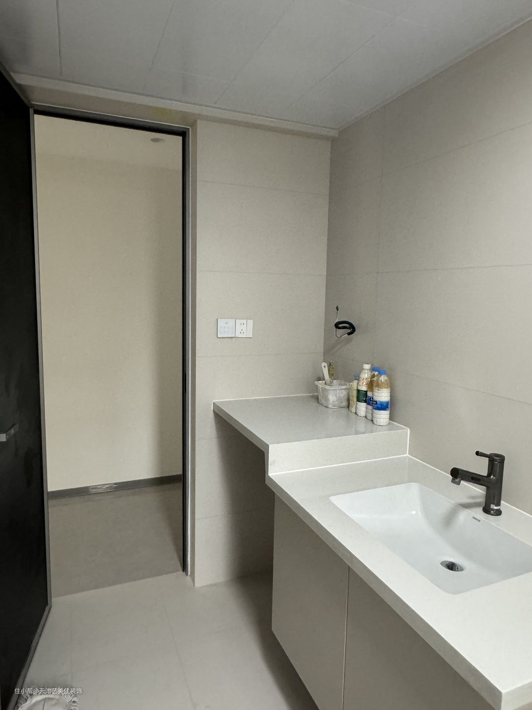客卫洗衣机浴室柜马桶花洒在一个区域内,我们将浴室柜洗衣机马桶台面做了定制,使用起来会更方便,浴室镜也是定做的还没进行安装,从细节上可以看到浴室柜采用悬浮设计,马桶壁挂式,方便后期打理卫生。淋浴区也做了玻璃隔断设计,起到干湿分离的效果。