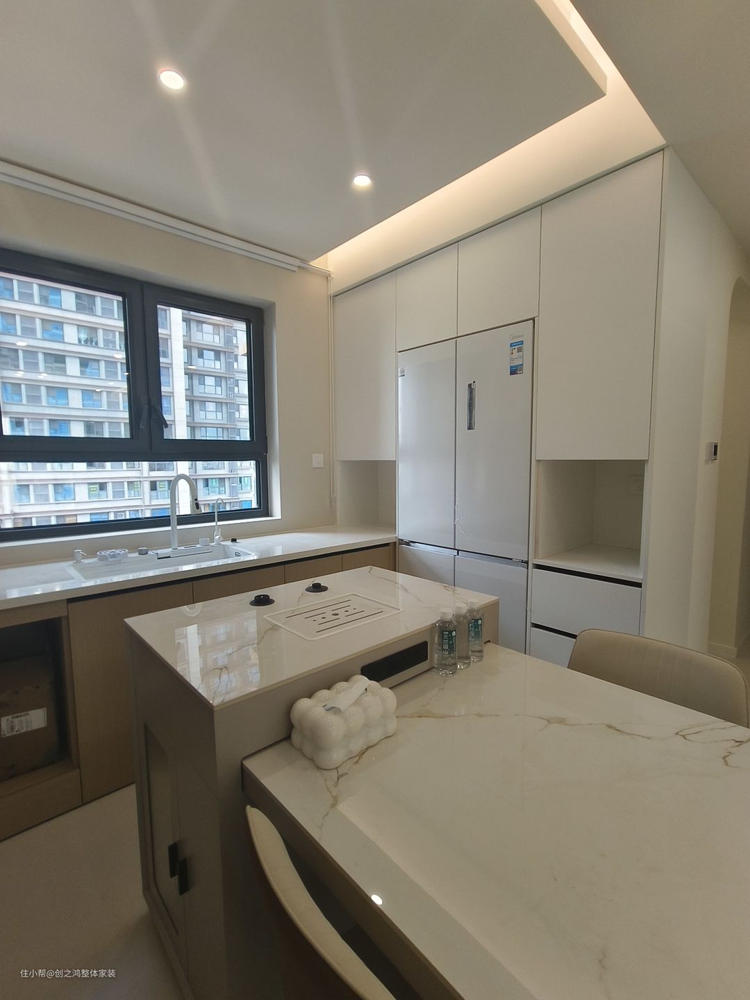 餐厅做联动式岛台的设计,白色的岩板餐桌搭配白色的软包餐椅让人置身到舒适的用餐环境中,岛台还可以增加一部分收纳储物功能,非常实用!
