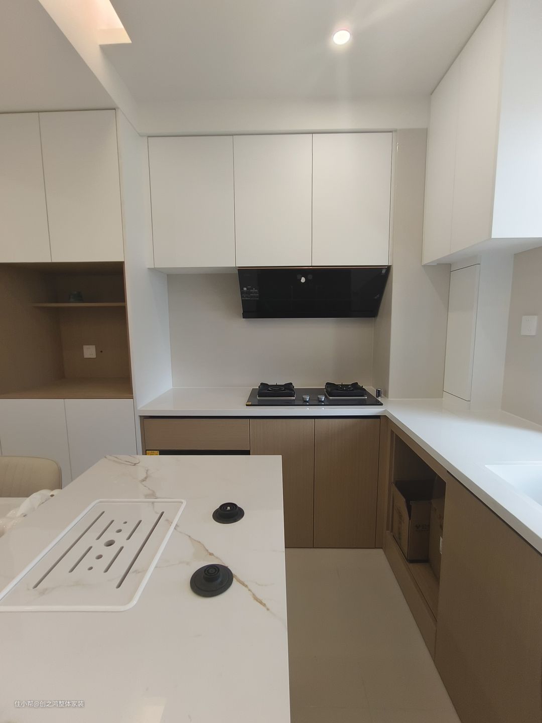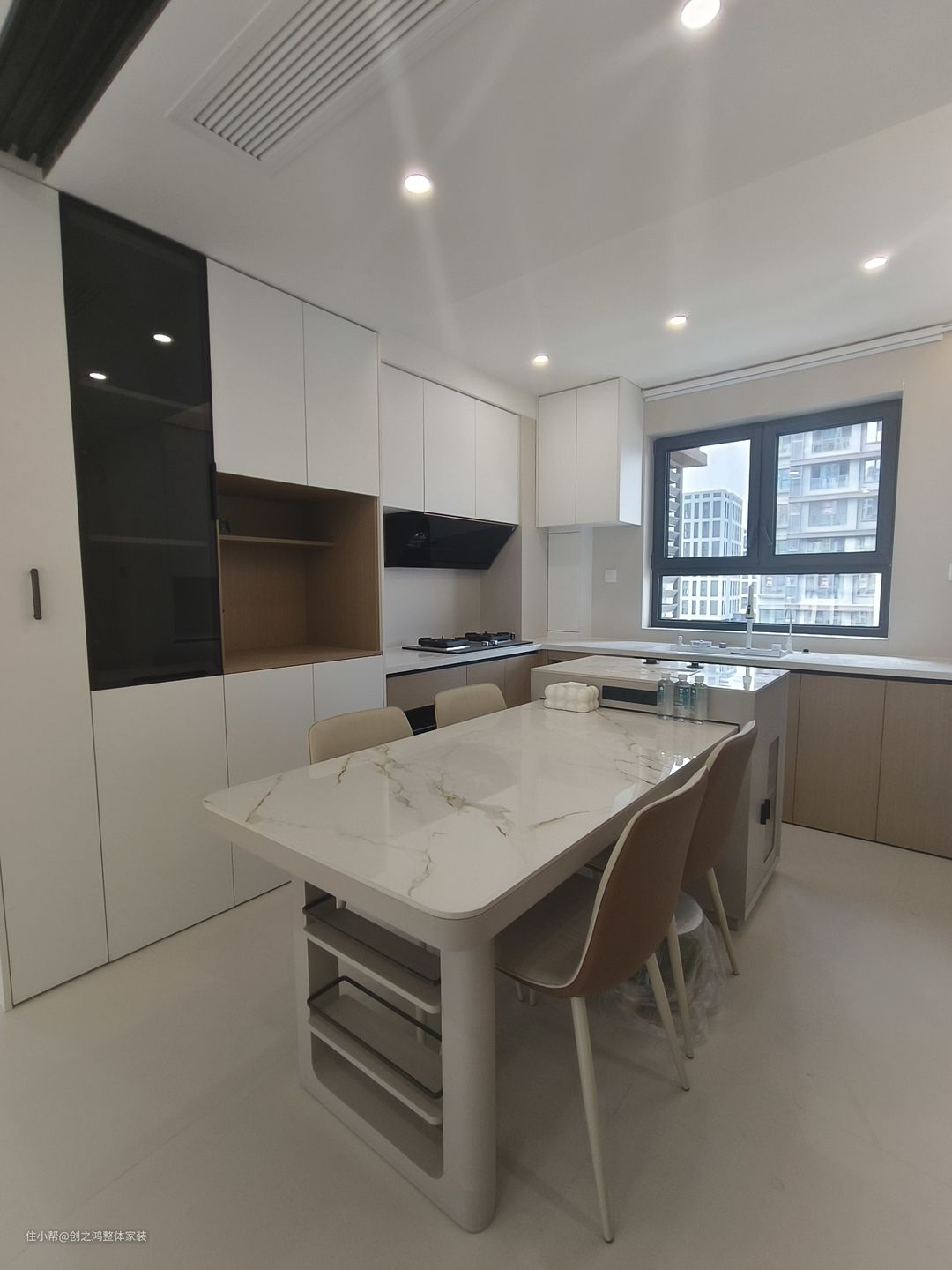 厨房做餐厨一体化设计,巧妙利用联动门打造一个既可以封闭又可以通透的餐厨空间,厨房做U型设计,高低柜巧妙将电器嵌入到柜体内,设计更加简约~