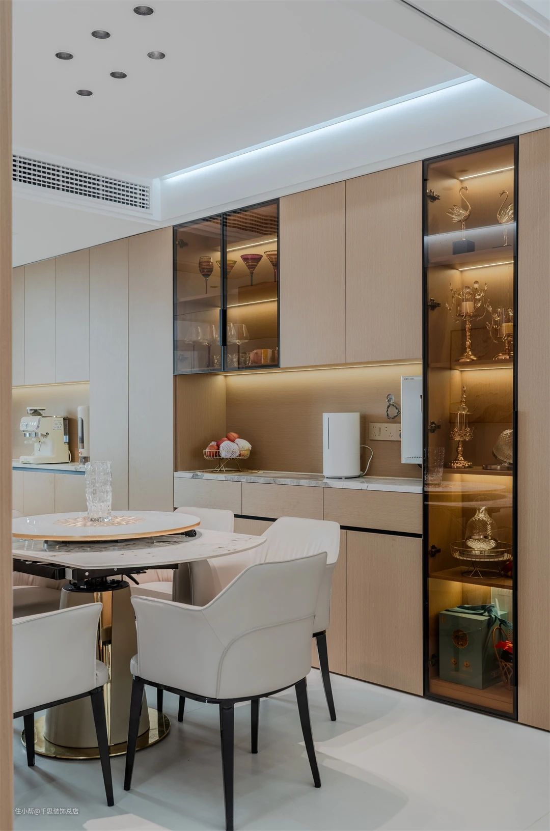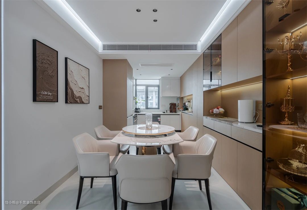 ▲ 餐厅,延续客厅格调,采用无主灯设计,落落大方。米白色餐桌椅干净治愈,两幅装饰画点缀墙面,打破单调,舒适温馨的用餐环境。餐厅现代实用,木色餐边柜与书柜风格统一,黑玻柜门搭配开放格,既展示物品又方便收纳,营造出兼具美观与功能的用餐环境。