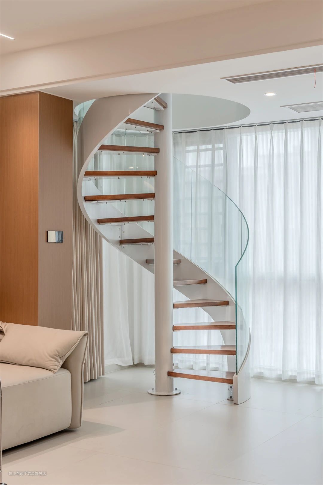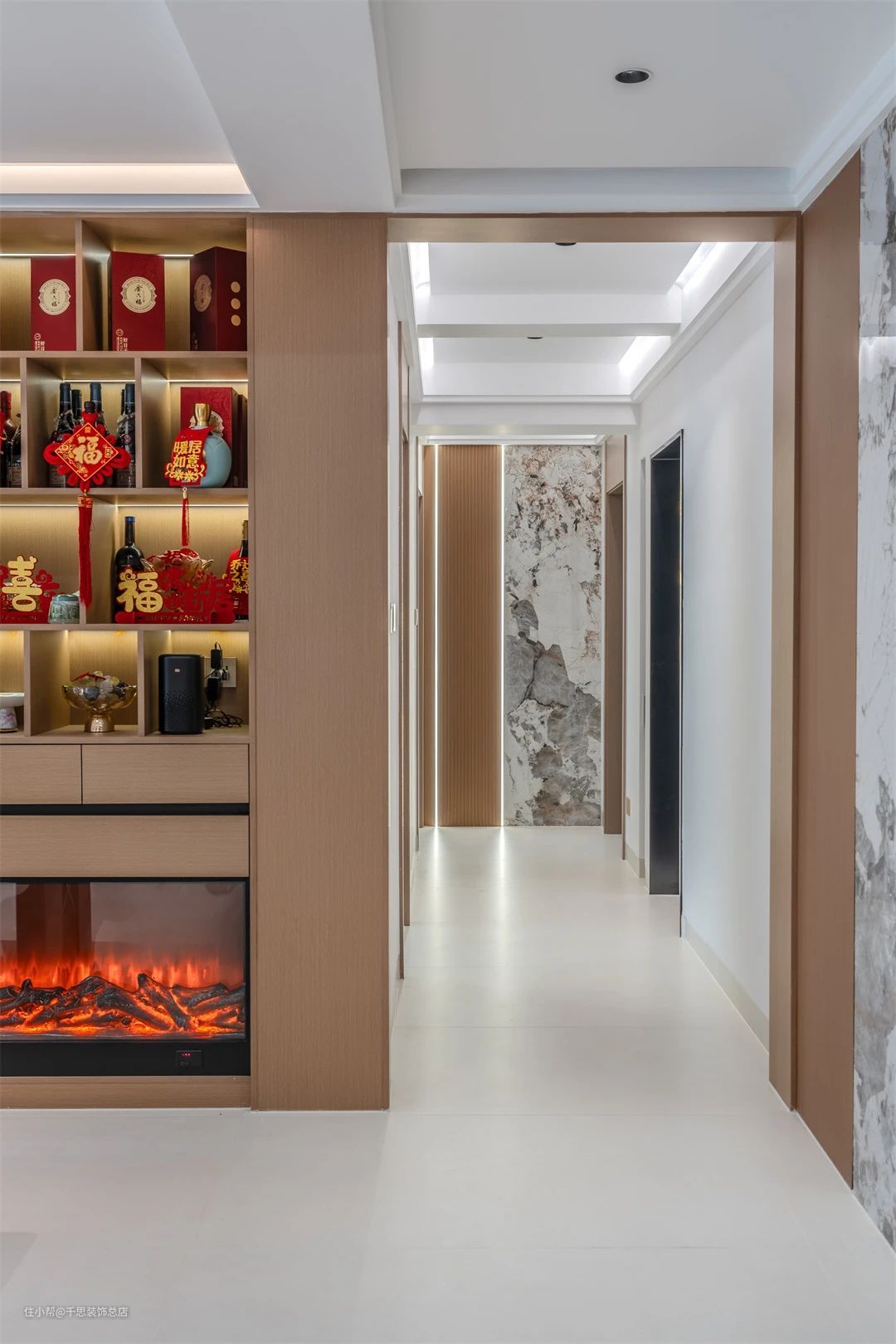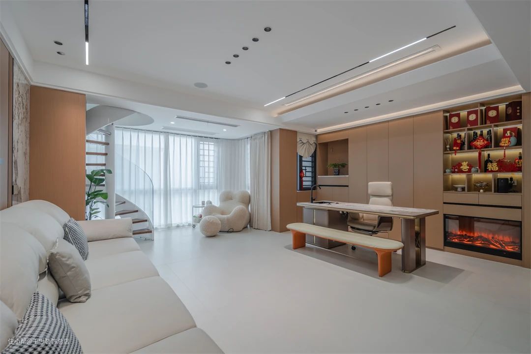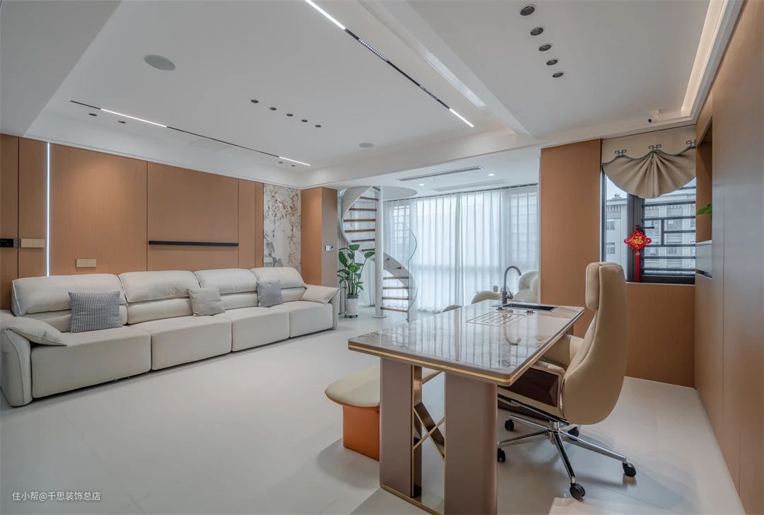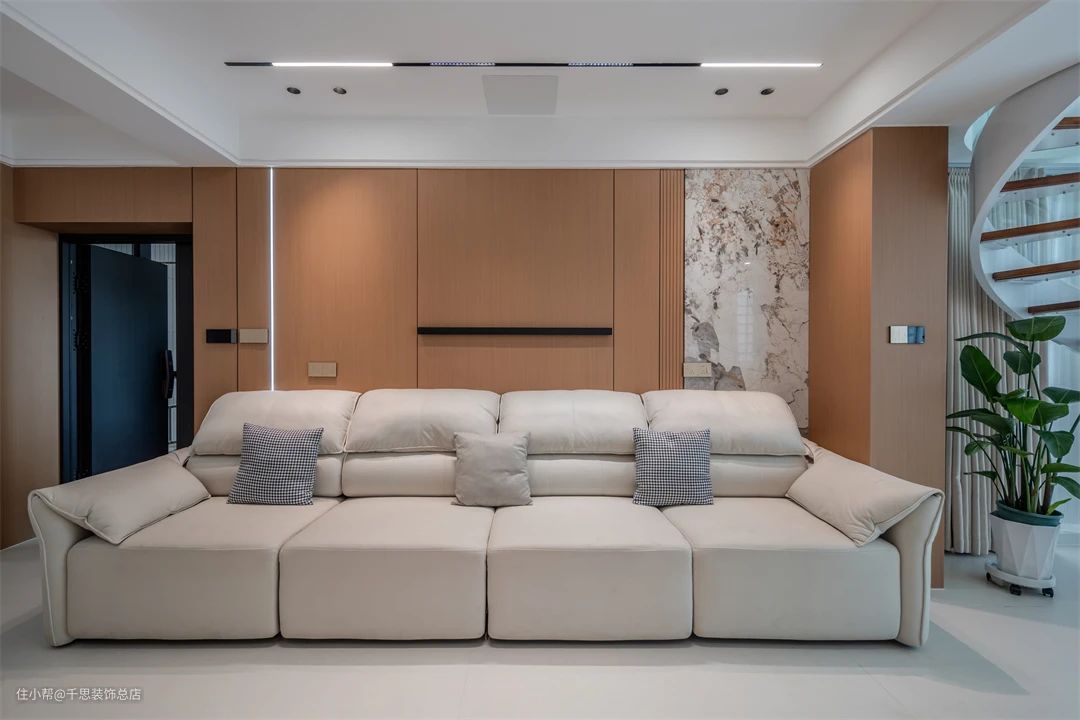 ▲ 过道,顶面采用无主灯搭配氛围灯带,营造舒适光线。尽头以岩板作为端景,增添视觉焦点。沙发一侧设计旋转楼梯进入二楼区域。