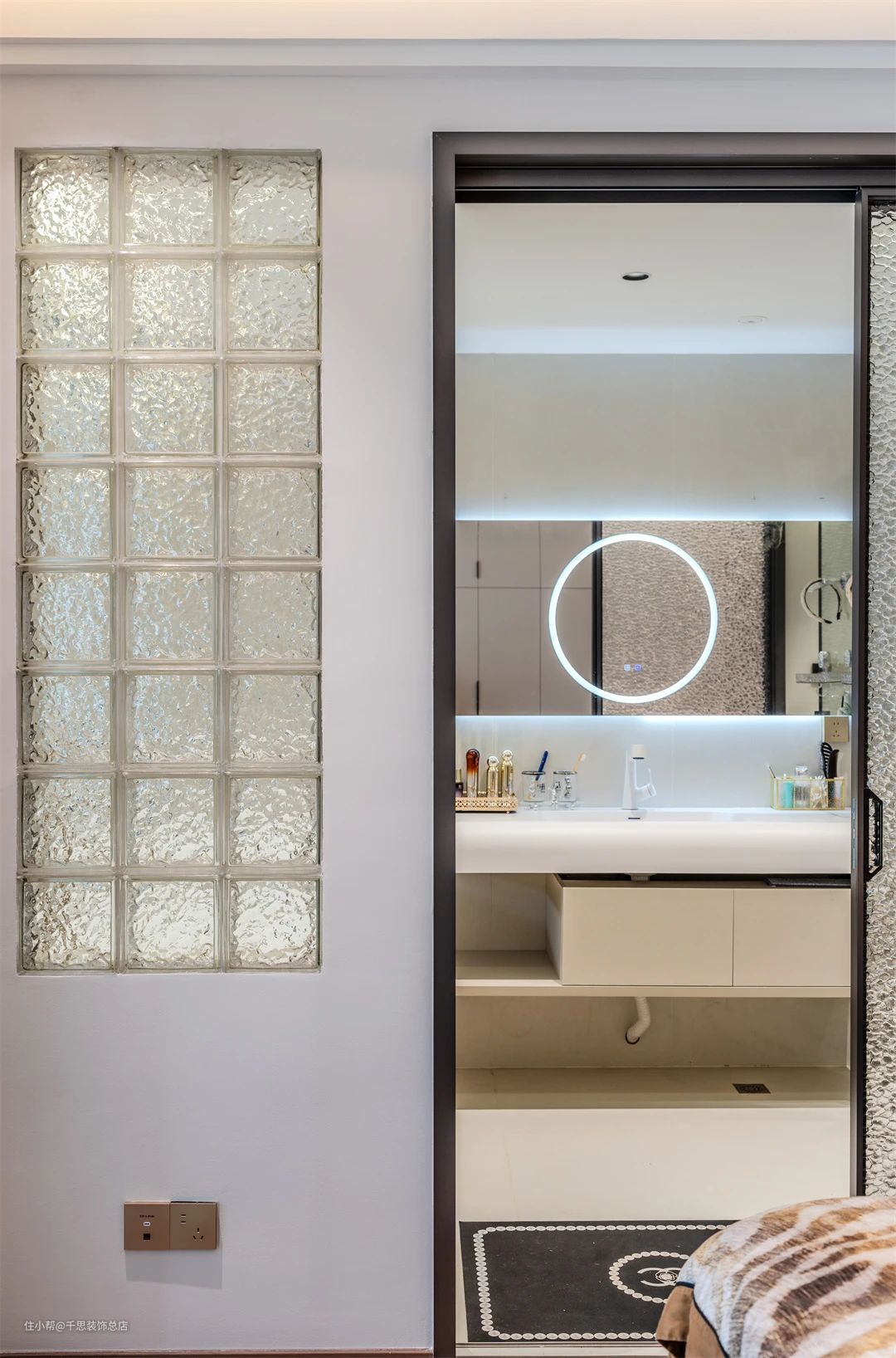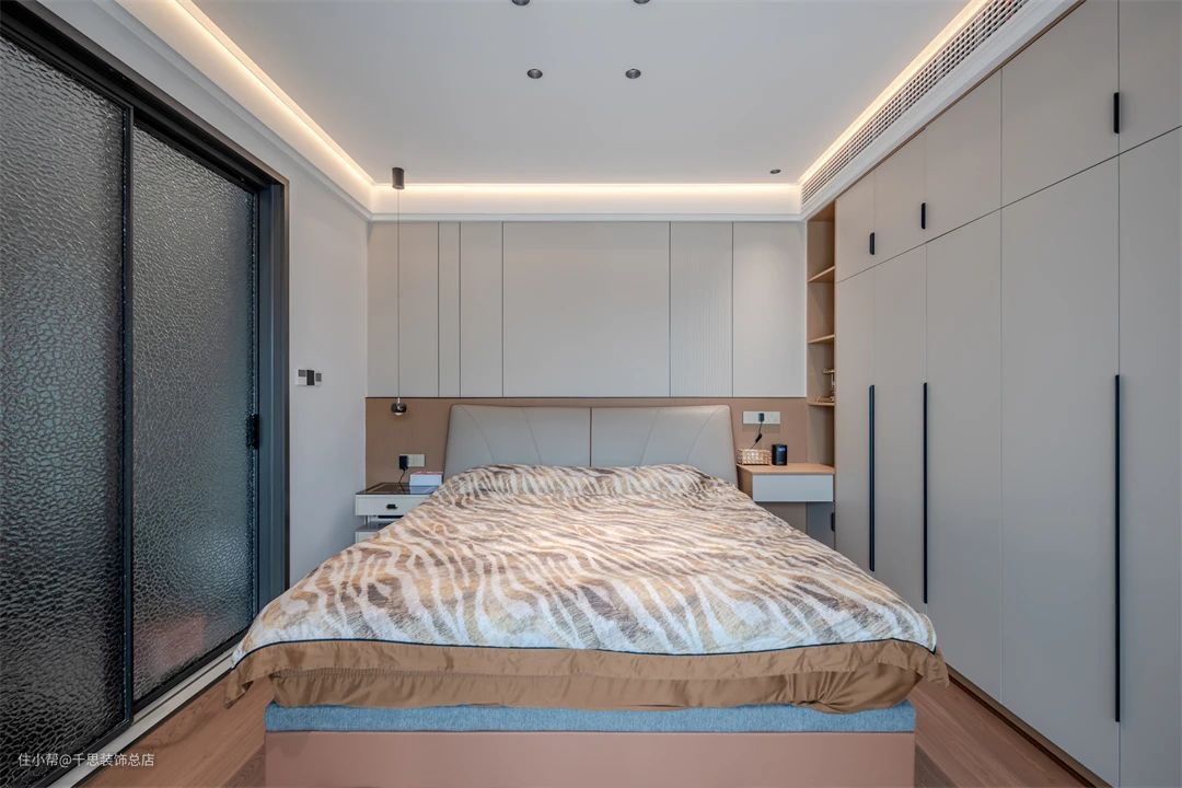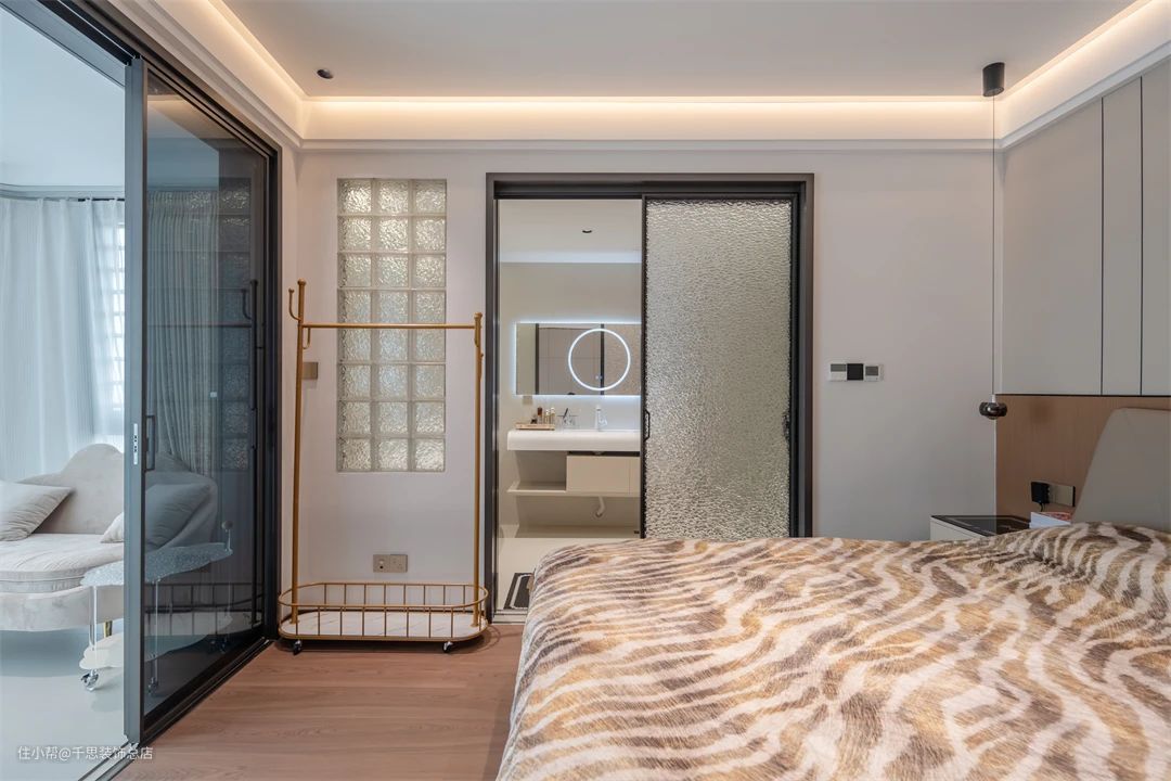 ▲ 巧妙融合卫浴空间,推拉门隔断简洁实用。小型落地衣架有效整理衣物,保持空间整洁。展现出现代感与实用性,营造舒适温馨的氛围。米色床头柜的镂空设计独具匠心,不仅增添时尚感,更方便随手取物。线性吊灯简约而不失优雅,夜晚点亮时,营造出温馨舒适的氛围。