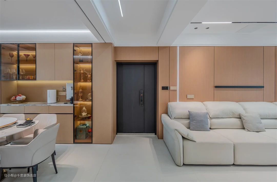 ▲ 客餐厨一体设计,木白混搭色彩,营造温馨舒适的氛围。入户门配以木色门框,与整体风格相呼应,彰显现代原木主题,空间统一和谐。
