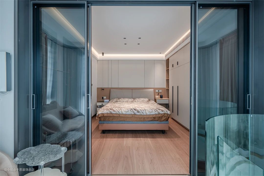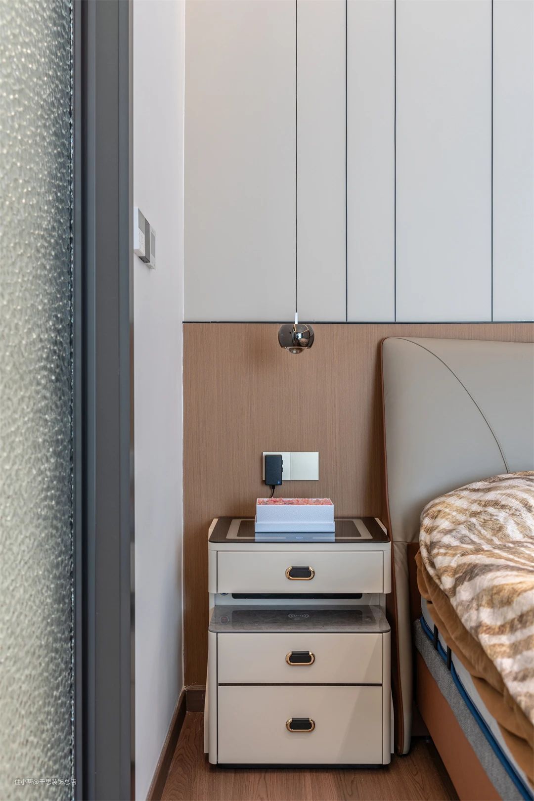 ▲ 温润木地板铺陈整个空间,营造清雅氛围。无主灯设计简约大方,凸显现代感。整体布局舒适开阔,呈现出宁静与精致的完美融合。卧室简约而不失温馨,淡雅床品与白木色彩和谐搭配。悬空床头柜节省空间,更显别致。整体布局舒适整洁,呈现一种宽敞明亮的氛围。