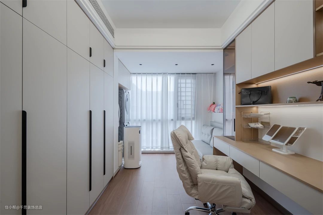▲ 次卧充分利用空间,沿墙打造收纳柜,白色搭配黑色拉手,简约时尚。另一侧巧妙布局学习与办公区,打造整洁有序的私人空间。