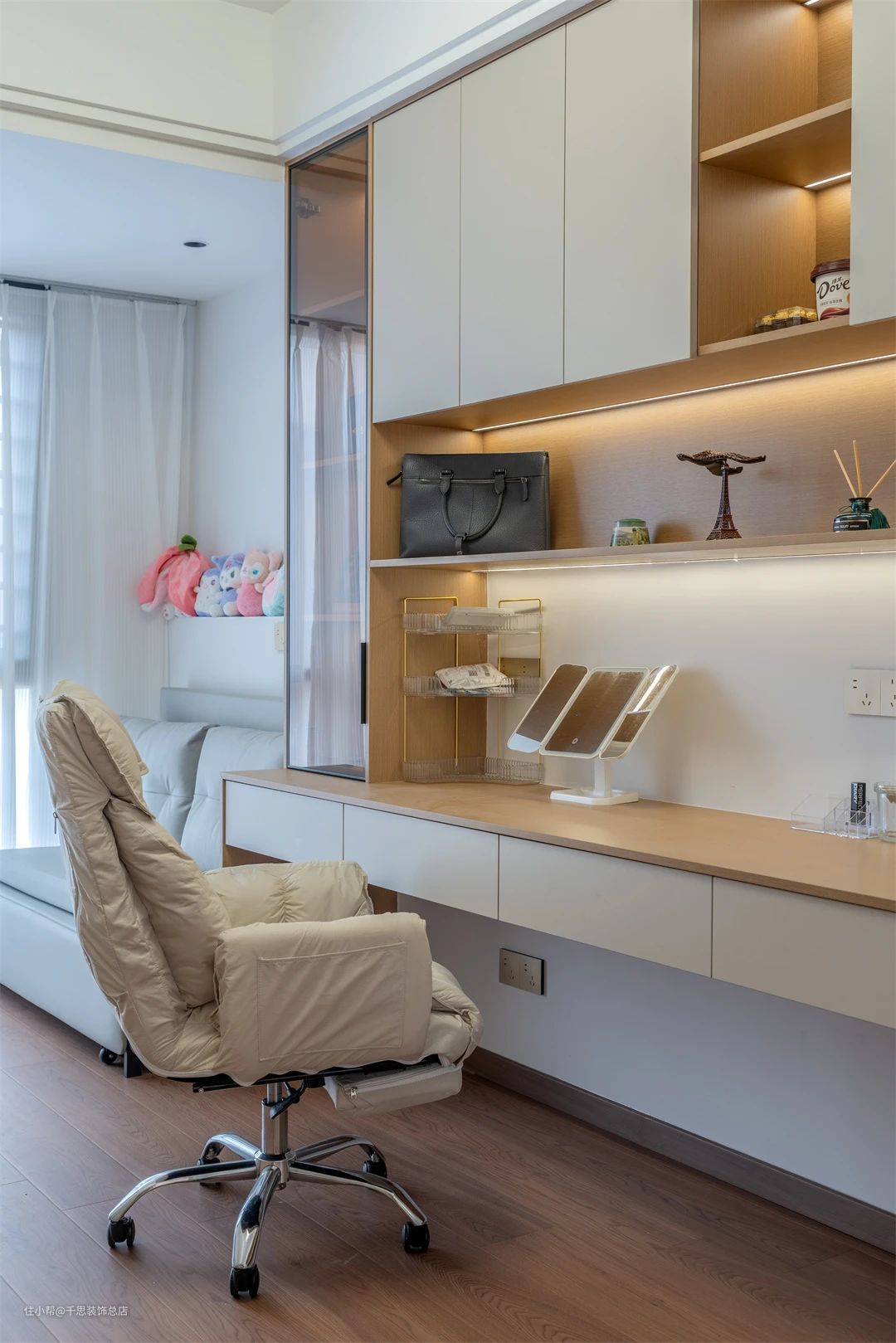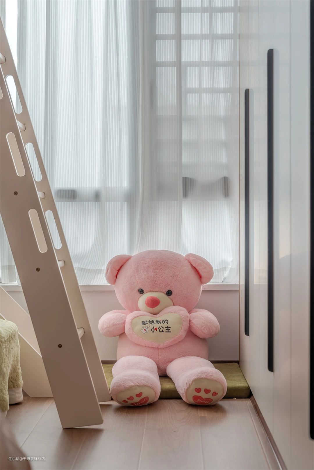 ▲ 空间细节图。粉色小熊玩偶临窗摆放,营造出烂漫纯粹的卧室氛围。书桌旁摆放着小型灰色沙发,累了便可以躺上,慵懒惬意一角。