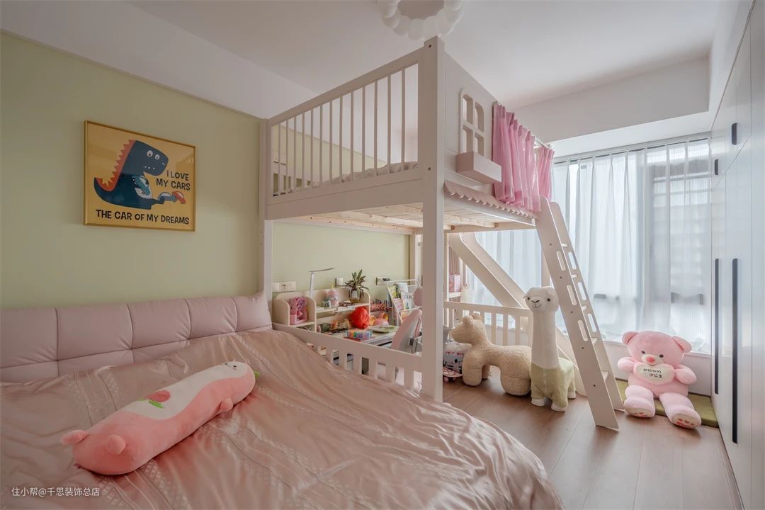 ▲ 儿童房巧妙融合甜美与功能性,鹅黄色背景墙营造治愈氛围。大床旁设置上下床,满足孩子休息和玩耍需求,打造温馨而实用的成长空间。